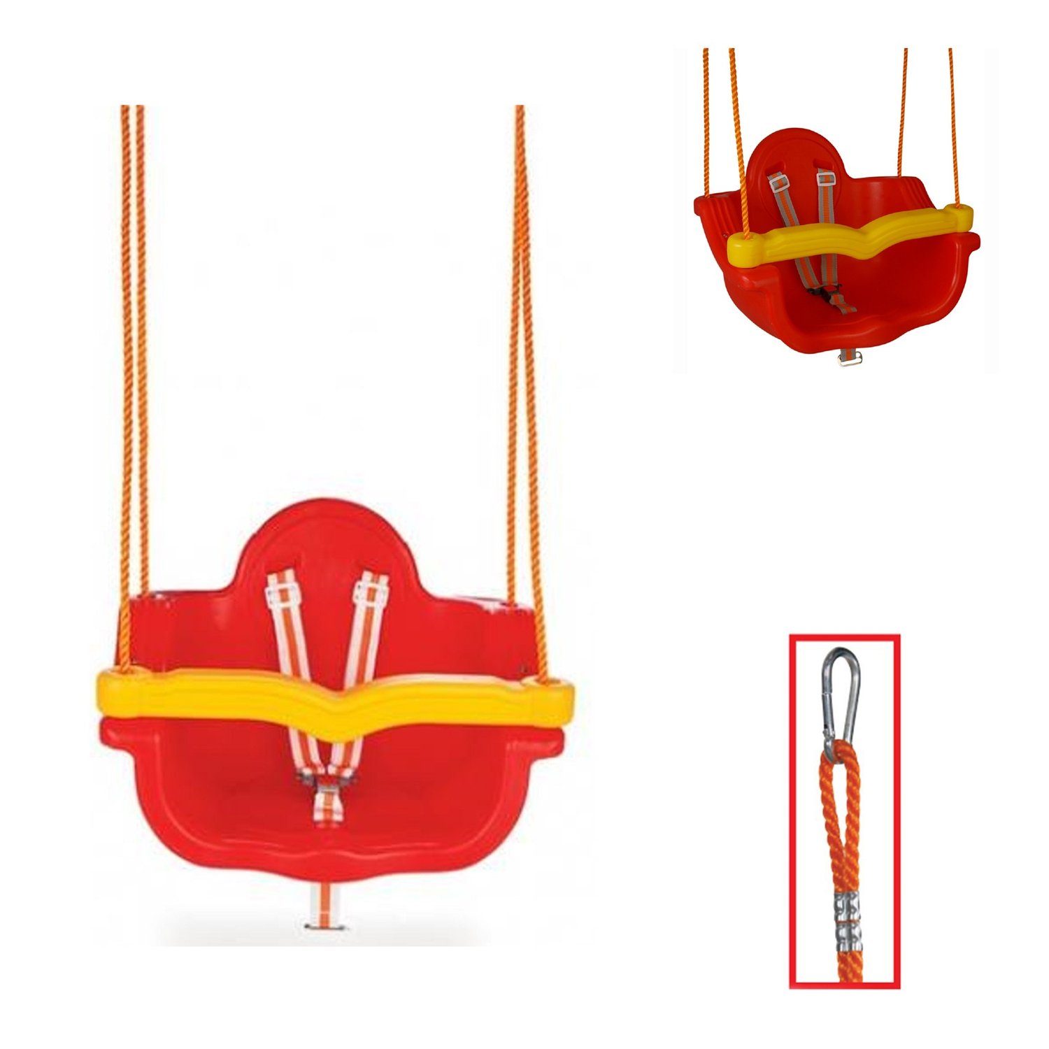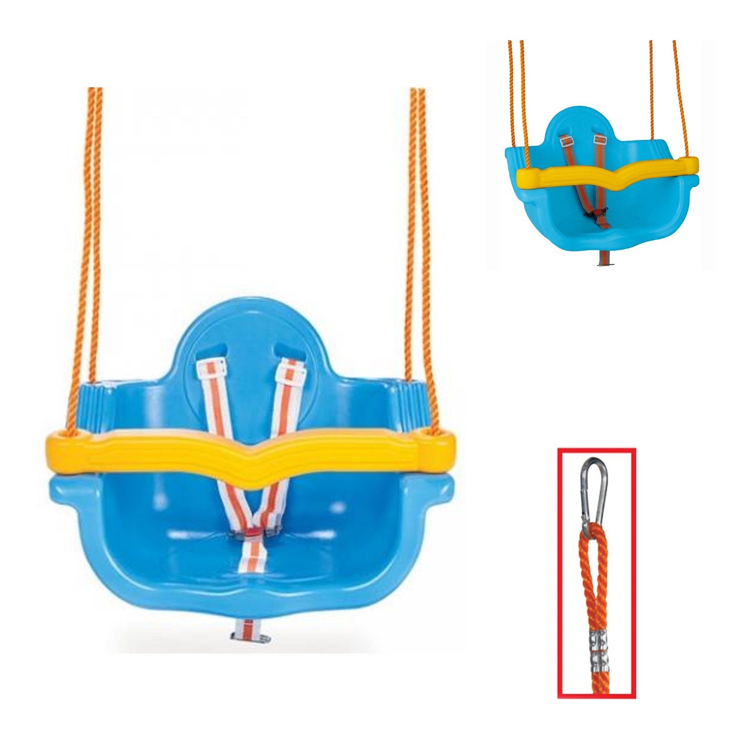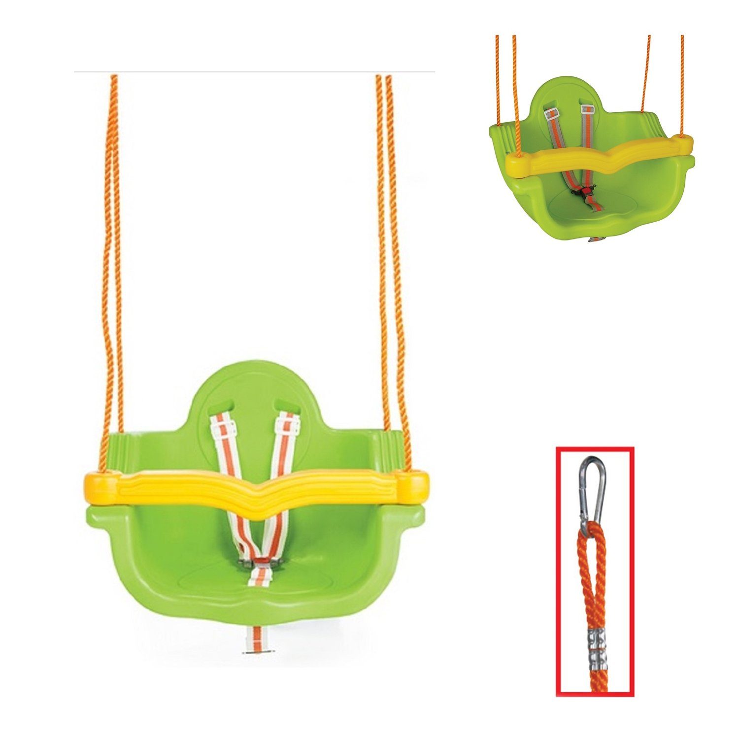 Die Babyschaukel 2 in 1 ist mit einer Kunststoffhalterung als Rausfallschutz, hoher Rückenlehne und einem Sicherheitsgurt ausgestattet. Eine tolle Gartenschaukel, die mit Ihrem Kind mitwächst. So können bereits Kleinkinder ab 1 Jahr mit der Schaukel viel Spaß haben. Die Kunststoffhalterung als Rausfallschutz kann, wenn Ihr Kind sicher in der Schaukel sitzen und sich selbst festhalten kann, abgenommen werden, ebenfalls lässt sich der Sicherheitsgurt später einfach abnehmen. Die Schaukel ist mit verstellbaren Seilen und Aufhängeringen ausgestattet. Durch die hohe Rückenlehne ist Ihr Kind optimal von hinten geschützt.
