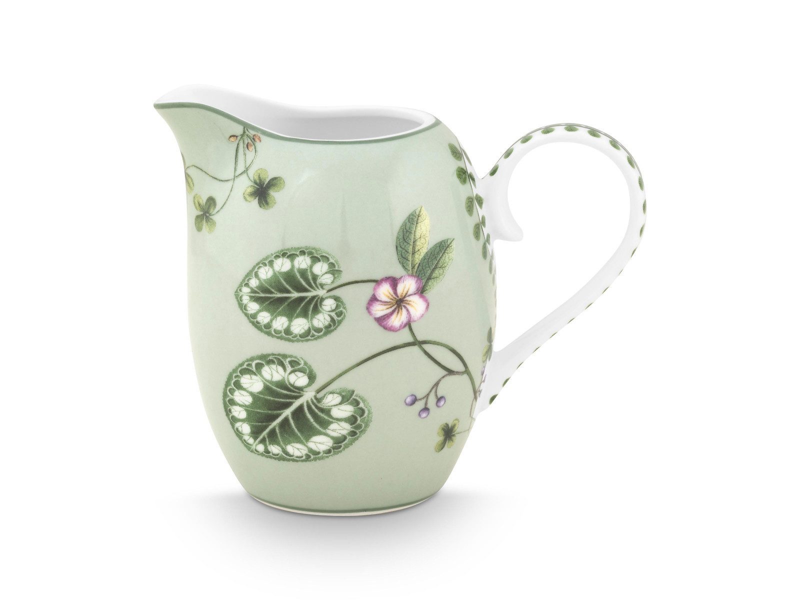 Der PIP STUDIO Lily & Lotus Light Green Krug mit einem Fassungsvermögen von 250 ml verbindet tropische Eleganz mit hochwertiger Verarbeitung. Das florale Design, inspiriert von Lotusblumen, und der zarte pastellgrüne Farbton verleihen dem Krug eine stilvolle und frische Ausstrahlung. Hergestellt aus hochwertigem Porzellan, eignet sich der Krug ideal für Milch, Sahne oder kleine Getränkemengen – perfekt für den Alltag oder als dekorativer Akzent auf Ihrer Tafel.