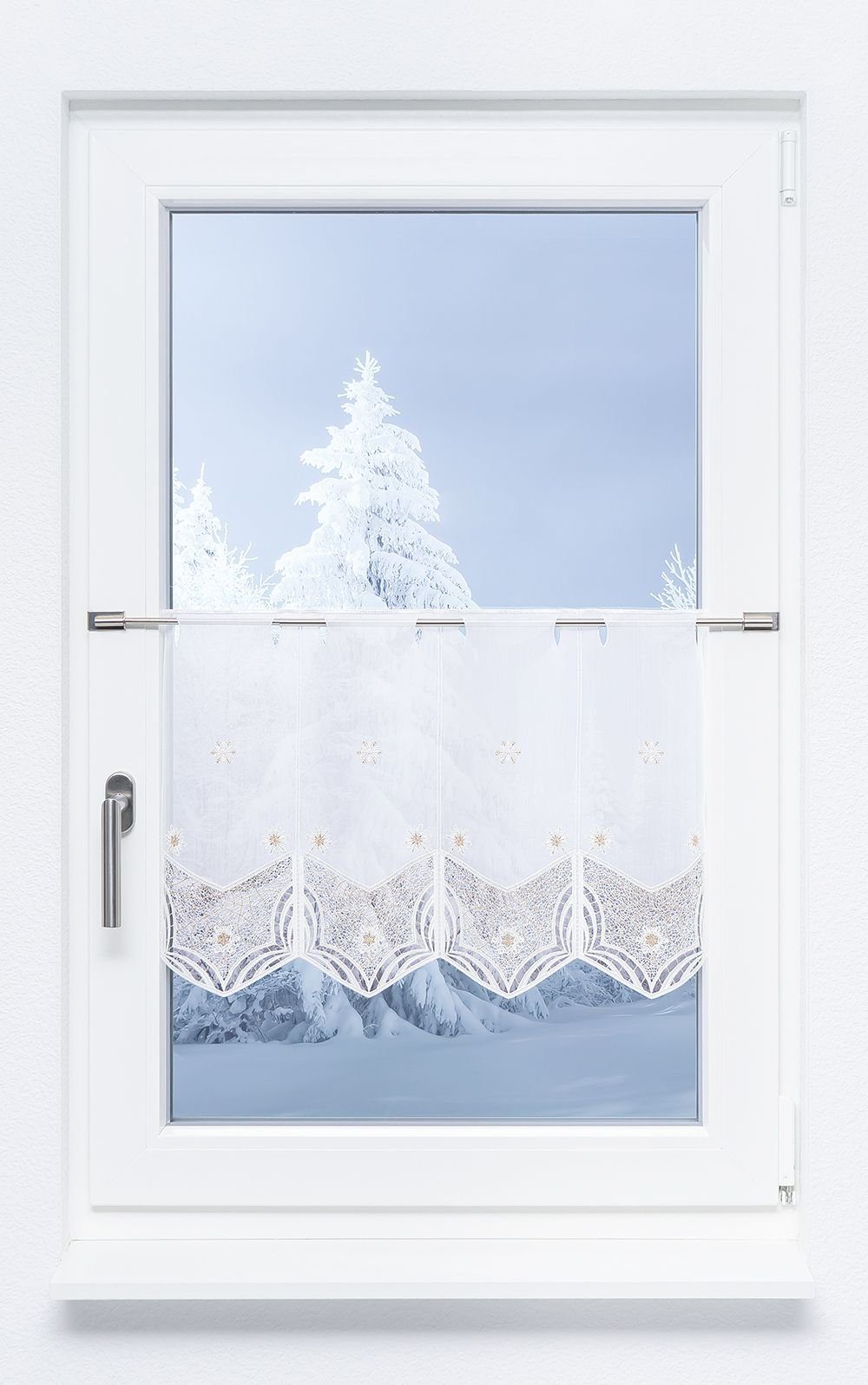 Diese Scheibengardine mit geradem oberen und gezacktem unteren Abschluss präsentiert eine Vielfalt von Mustern und Strukturen, ganz im Zeichen der Schneeblumen. Auf jedem Rapport ist mittig schon fast puristisch eine Schneeflocke zu sehen, zum unteren Abschluss hin zeichnet eine Form die Spitze nach, ist links und rechts des Rapports jeweils mit einer Schneeblume geschmückt. Der untere Abschluss ist mit hauchfeinem Fadengeflecht gestaltet. Die Bögen, die den unteren Abschluss und die Grenzen der Rapporte zieren, ergeben durch das direkte Zusammenspiel von weißer Spitze und durchsichtigen Bereichen einen wirkungsvollen, modernen Kontrast. Die Scheibengardine besteht aus 100 % Polyester und wird ohne Bohren per Stangendurchzug auf eine Klemmstange, Pinnstange oder Vitragenstange aufgezogen und ins Fenster gehängt..