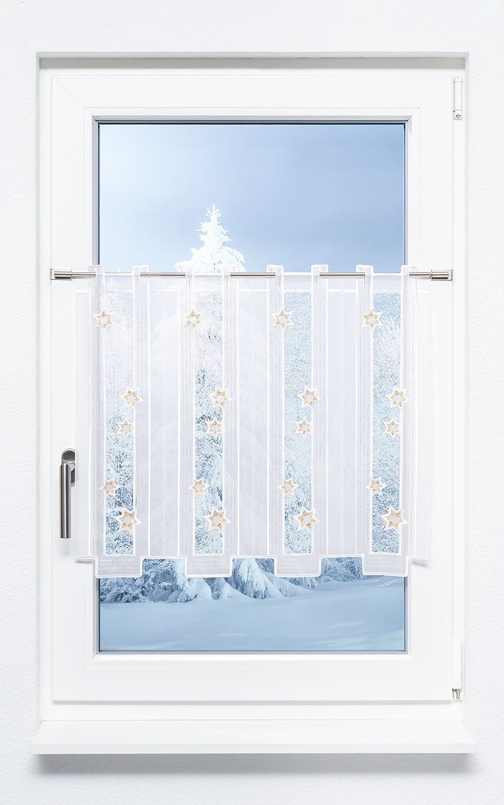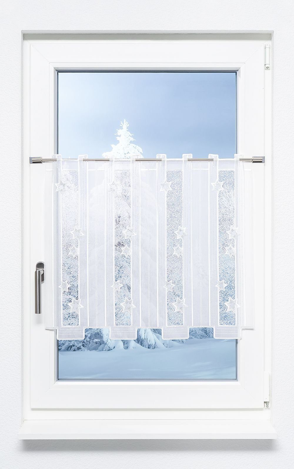 Diese Scheibengardine verbindet ein modernes Design mit klassischer Eleganz. Die als geometrische Rechteckformen gestalteten oberen und unteren Abschlüsse verleihen dem ganzen Modell eine geradlinige, reduzierte Optik sowie eine ruhige Ausstrahlung. Dabei setzen sich die Rapporte aus abwechselnd gestalteten Balken zusammen. Mal sind diese mit Strukturgeflecht und Sternen verziert, mal sind sie einfach nur durch feine, senkrecht verlaufende Linien in zwei Hälften geteilt. Die Sterne sind bei dieser Scheibengardine aus Plauener Spitze® der einzige farbige Akzent und stechen dadurch hervor. Die Scheibengardine besteht aus 100 % Polyester und wird ohne Bohren per Stangendurchzug auf eine Klemmstange, Pinnstange oder Vitragenstange aufgezogen und ins Fenster gehängt..