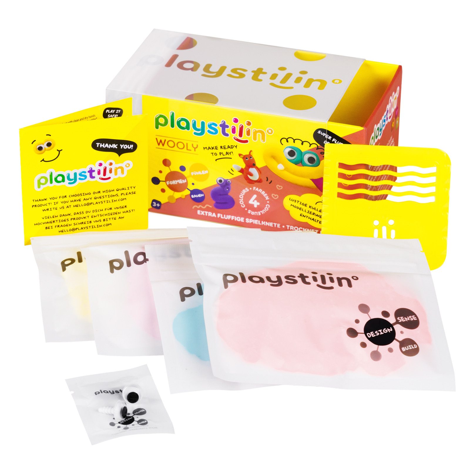 ORIGINAL: playstilin® WOOLY Spielknete in 4 Farben für Kinder ab 3 Jahren. Die extra fluffige Knetmasse für superleichten Knetspaß! Nicht trocknend! Durch die enthaltenen