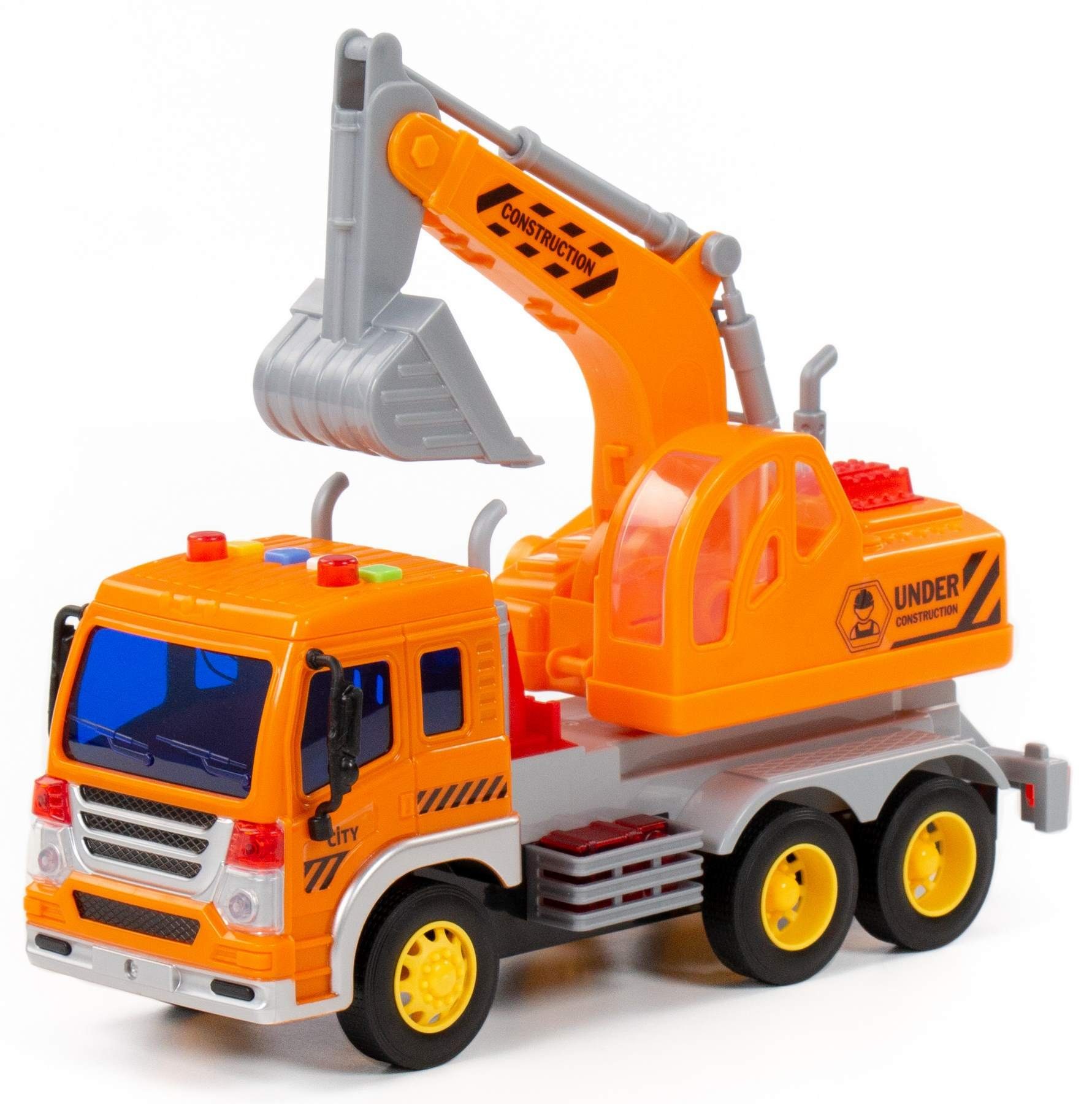 Mit diesem Schaufelbagger-LKW bringen Sie die Augen Ihrer Kleinen zum Leuchten. Dieser große, bespielbare LKW mit beweglichen Funktionen in einer originalgetreuen und kindgerechten Nachbildung bietet viele Spielmöglichkeiten. Vier Drucktasten für Licht- und unterschiedliche Soundeffekte machen das Spielen zu einem echten Erlebnis. Stundenlanger Spiel- und Fahrzeugspaß ist garantiert. Robuste Profil-Gummireifen und Stahlachsen sorgen für leise Fahrgeräusche und Stabilität. Zudem ist der LKW mit einem Friktion-/Schwungradantrieb ausgestattet. Los geht's...die Fahrt kann beginnen.
