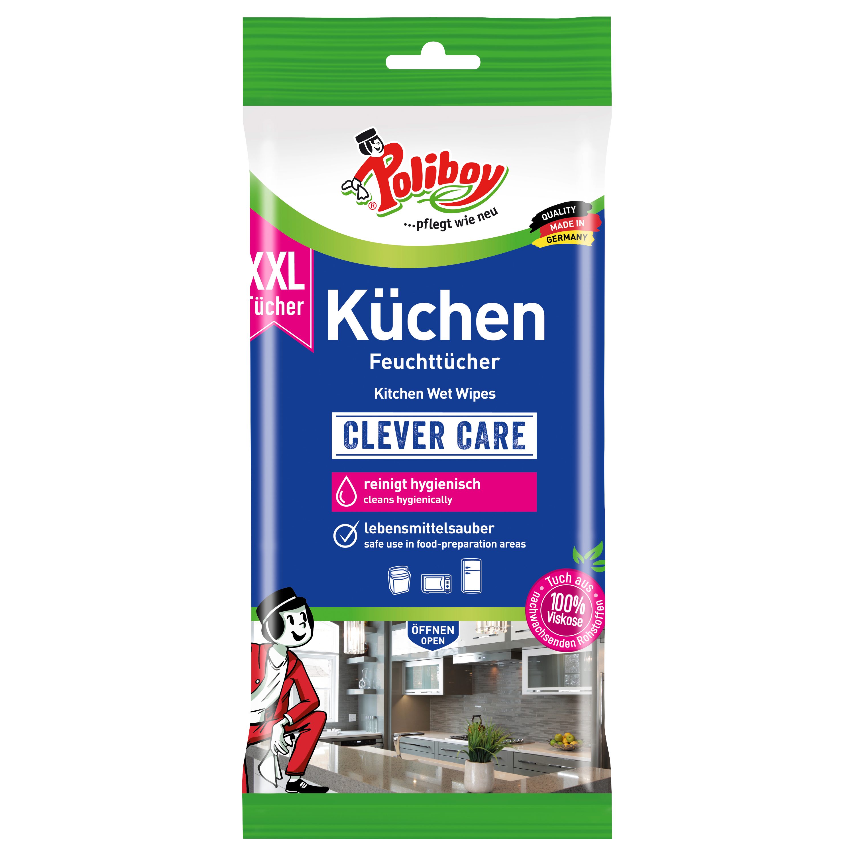 Die Tücher sind ideal für die schnelle und praktische Reinigung aller abwaschbaren Oberflächen wie Kühlschrank, Mikrowelle, Arbeitsplatte, Kühltasche oder auch Kühltruhen und Mülleimer. Dank der Rezeptur mit Bio-Alkohol und Aktivstoffen der Orange reinigen die Tücher nicht nur hygienisch, kraftvoll und streifenfrei mit einem Wisch, sondern sind wie gerade in diesem Bereich besonders wichtig lebensmittelsauber, d.h. das Wischen in Bereichen in denen Lebensmittel gelagert werden, ist unbedenklich. Zusätzlich sorgen die Aktivstoffe der Orange dafür, dass unangenehme Gerüche - wie sie im Kühlschrank häufig vorhanden sind - beseitigt werden. Die XXL Küchen Putztücher sorgen somit für hygienische Sauberkeit und langanhaltende Frische und eignen sich ideal für die schnelle Anwendung zwischendurch. Einfach das anwendungsfertige Tuch aus der Verpackung entnehmen, wischen, fertig! Das Tuch kann danach einfach im Hausmüll entsorgt werden.