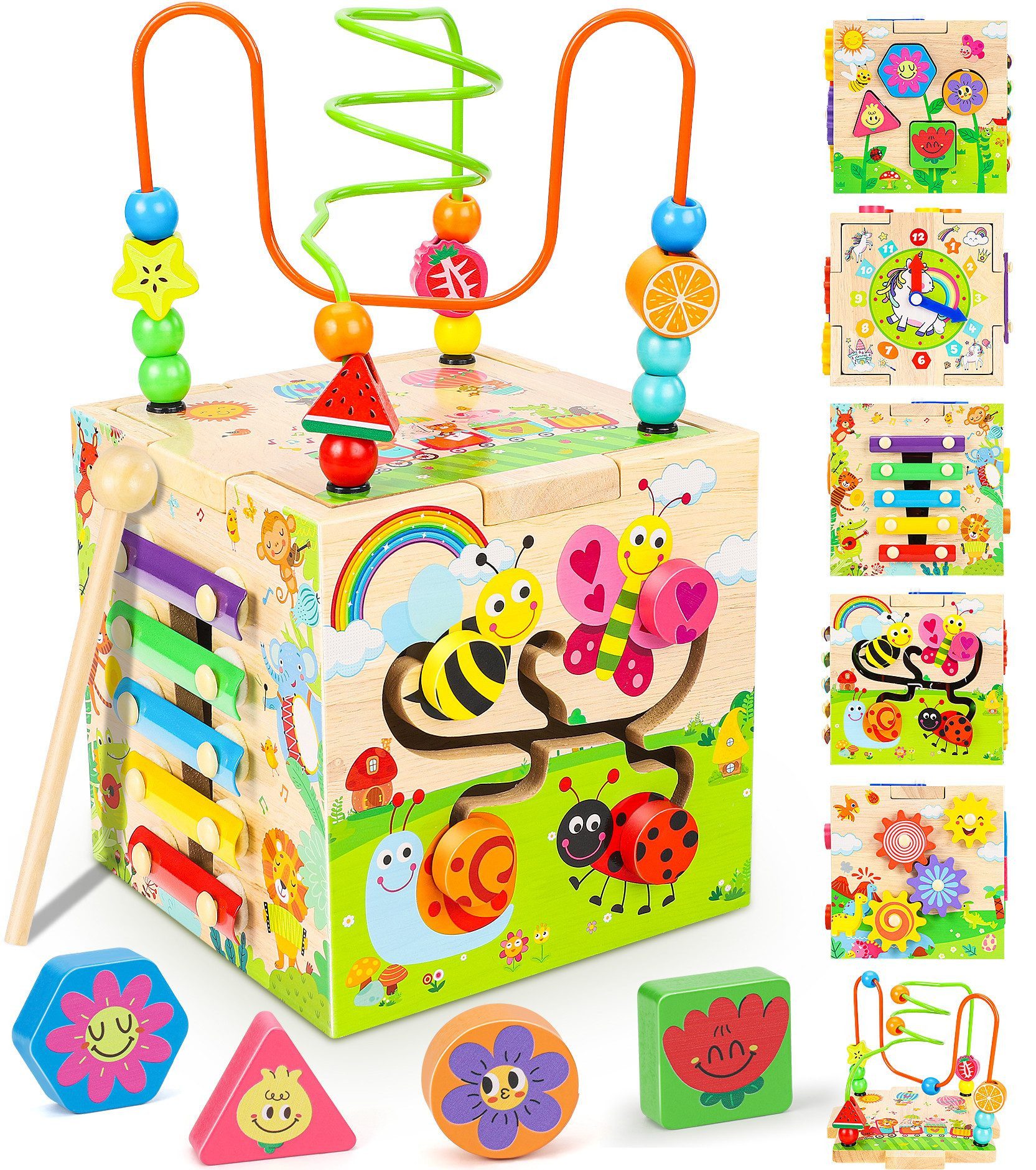 6 in 1 Aktivitätswürfel aus Holz Dieses Mehrzweck-Spielset enthält 6 Spiele in einem: Perlenlabyrinth, Spinning-Zahnräder, Formsortierer, Xylophon, Fliegendes Insekt, Lernuhr. Eine Vielzahl von Spielmethoden, um den unterschiedlichen Bedürfnissen von Kindern gerecht zu werden, sodass Kinder im Spiel erkunden, erleben und entdecken können. Es ist ein sehr gutes spielzeug ab 1 jahr baby