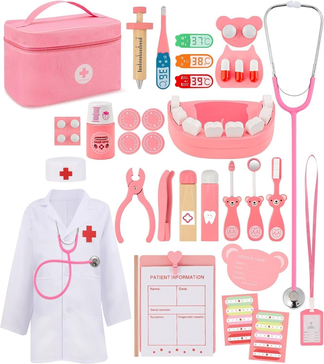 Spielzeug Enthält echtes Stethoskop, Arztkittel und kappe, Zahnform, JZahnspiegel, Holzspritze, Pinzette, Kapseln, Baumwolle, Brille, Thermometer, Bandage und verschiedene realistische Zahnpflege-Accessoires zur Reinigung und Behandlung.
