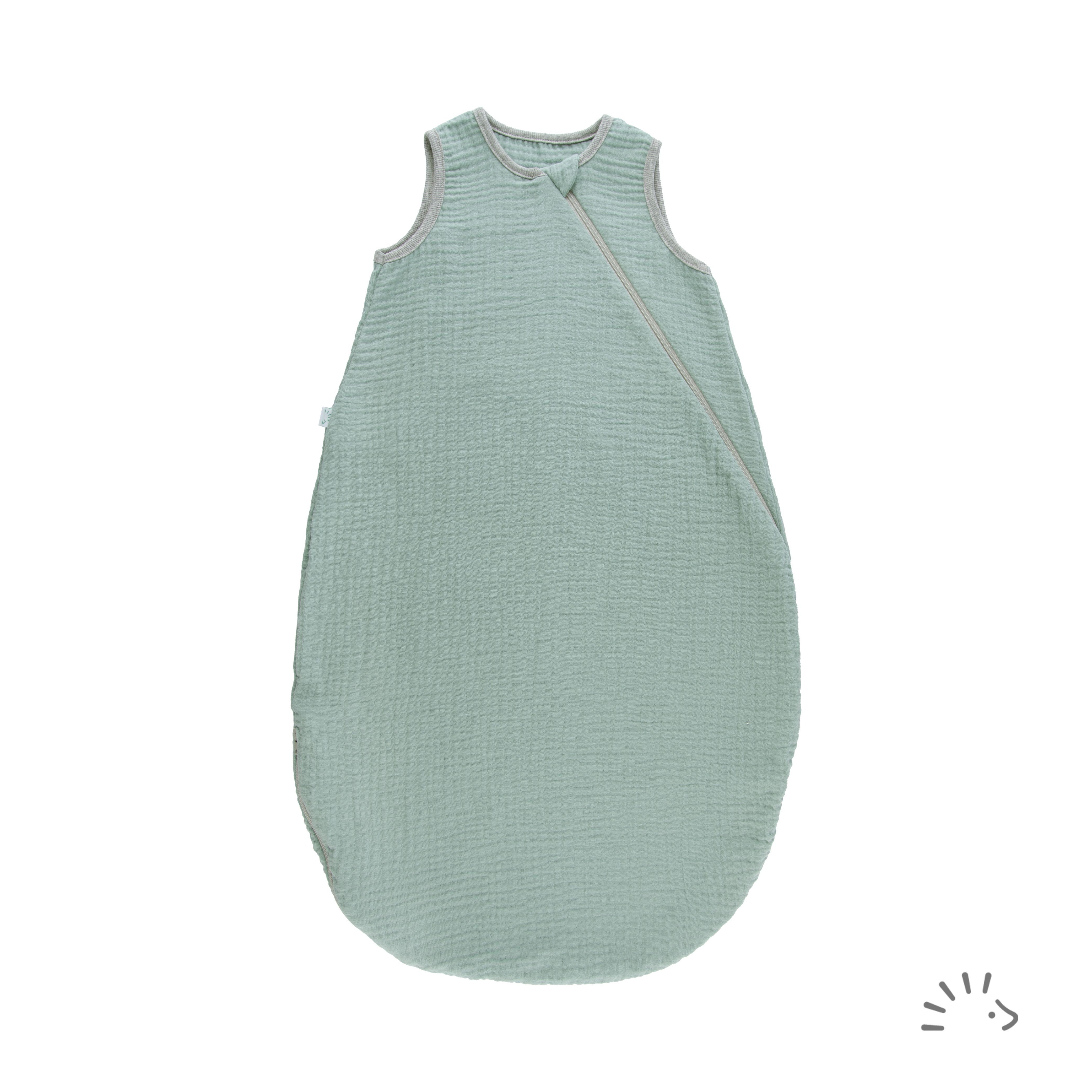 Der Popolini Sommer Schlafsack aus Topaz grünem Bio-Baumwolle-Musselin ist perfekt für warme Nächte geeignet. TOG 0,5 Raumtemperatur: über 24°C