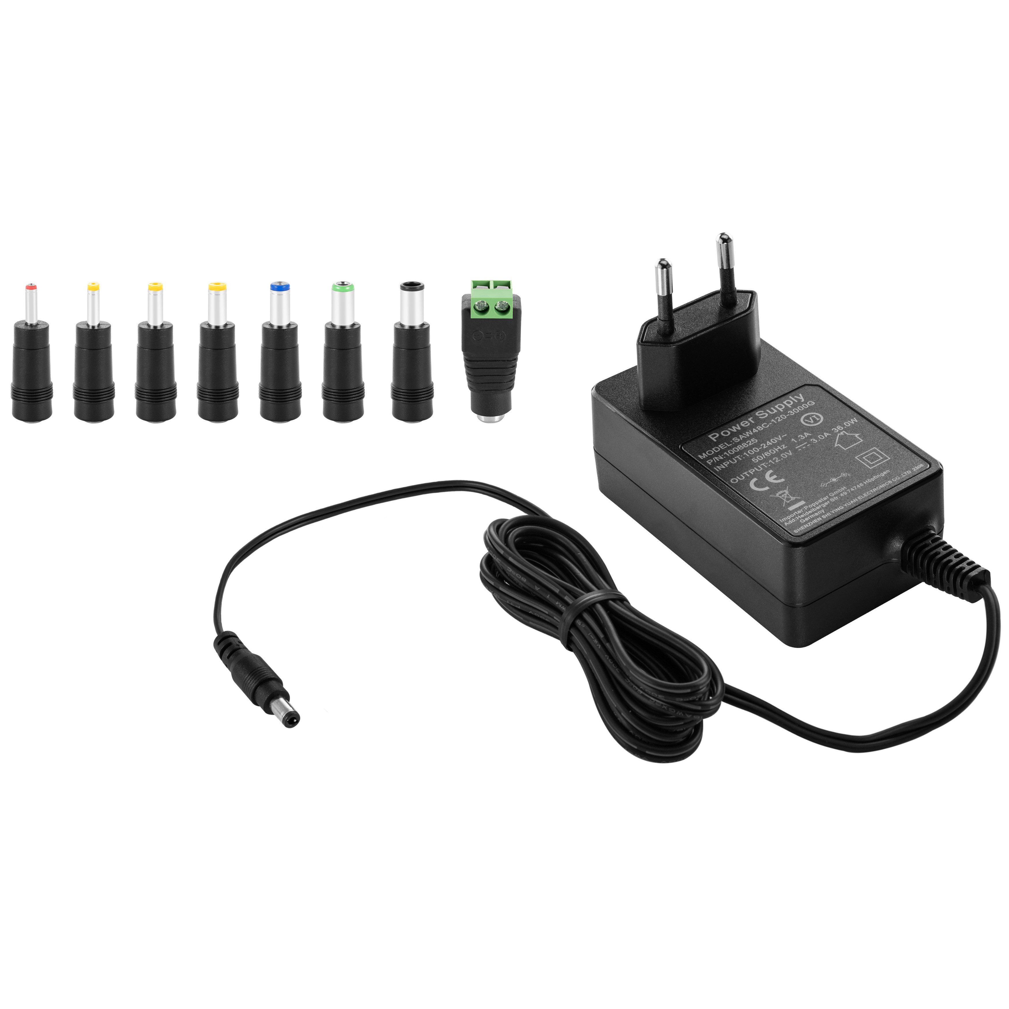 Lieferumfang | Lieferumfang: Poppstar Steckernetzgerät 12volt 3 A (Stecker-Typ C, Hohlstecker 5.5 / 2.5mm, länge Stromkabel 1,5m) + 8er Hohlstecker Set schwarz |