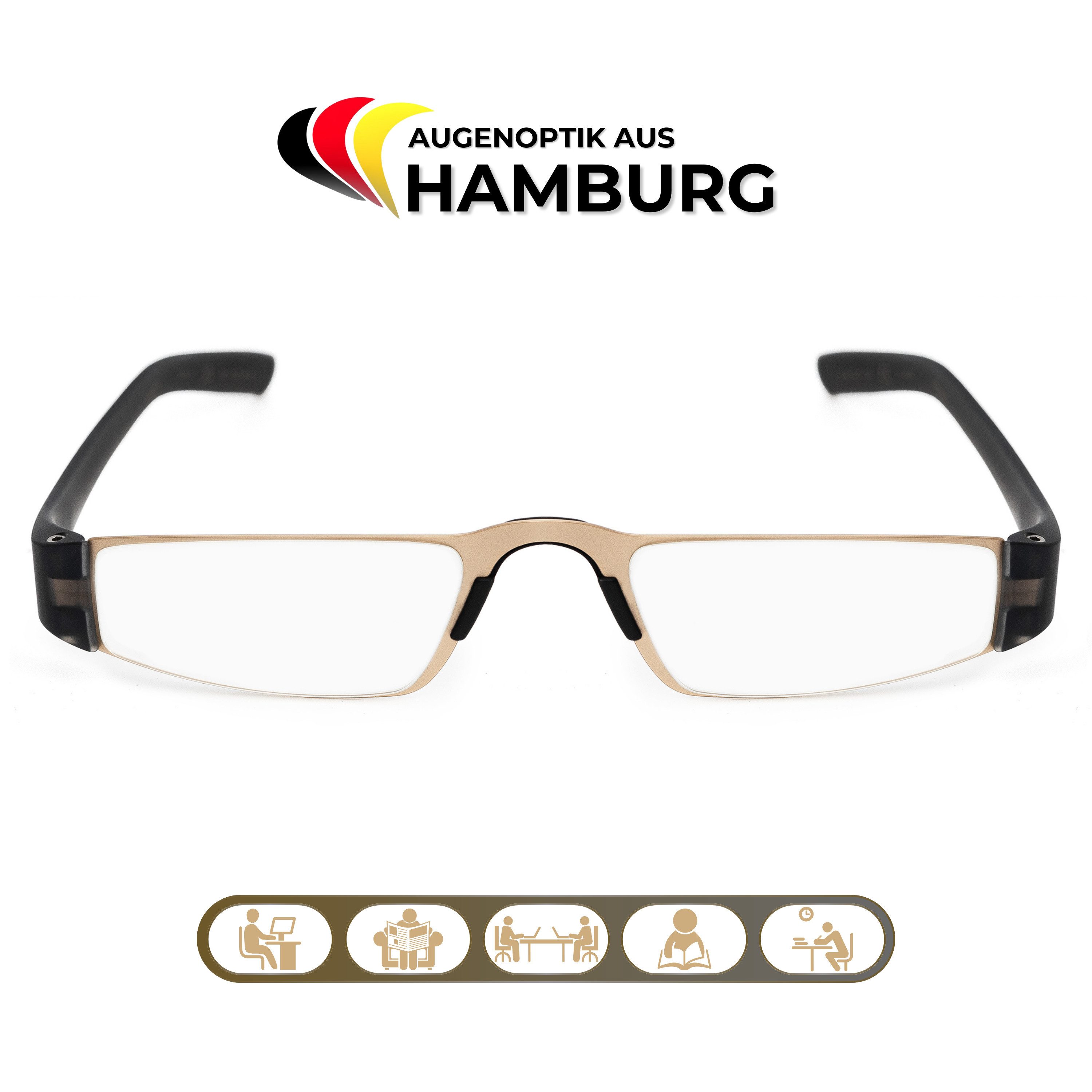 Die bruchsicheren, kratzfesten Kunststoffgläser ermöglichen entspanntes Lesen bei jeder Lichtbedingung und schützen die Augen zuverlässig vor UV-Strahlung. Die Brille ist in Dioptrienstärken von +1.0 bis +3.0 erhältlich – perfekt als stilvolle Lesehilfe für Alltag, Büro oder unterwegs.