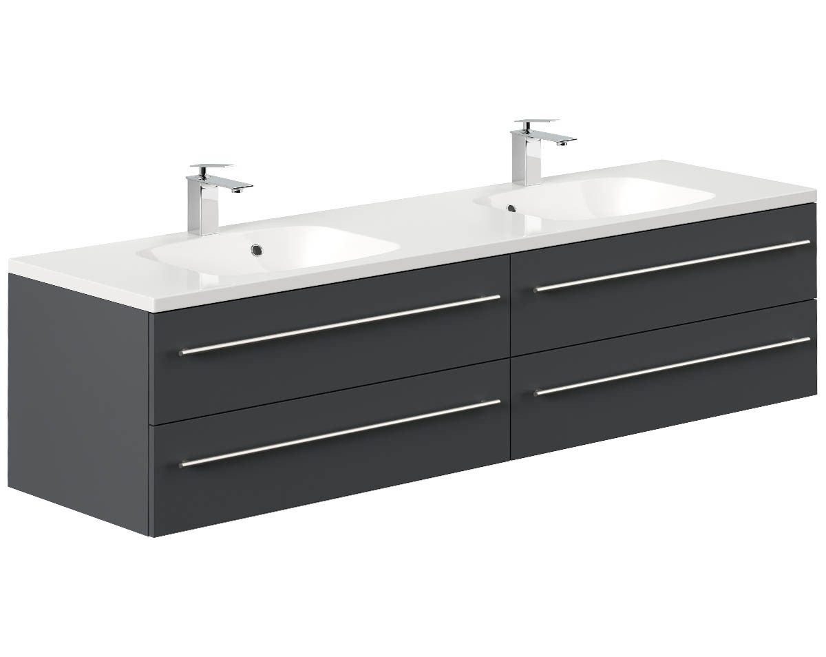 Zu zweit mehr Spaß im Bad! Optisch schmeichelnd fügt sich diese extra-geräumige Möbelserie ein in vorhandene Badelandschaften, oder bietet den soliden Möbel-Grundstein für eine komplette optische Neuausrichtung des Innendesigns. Die Qualitätsbeschichtung der Oberfläche sorgt nicht nur für ein schickes Finish der Möbel, sondern auch für eine optimale Versiegelung der Waschtische gegen Schmutz und Feuchtigkeit. Ausgestattet mit dem Anti-Fingerprint Effekt - keine Fingerabdrücke mehr dank supersofter Oberfläche!