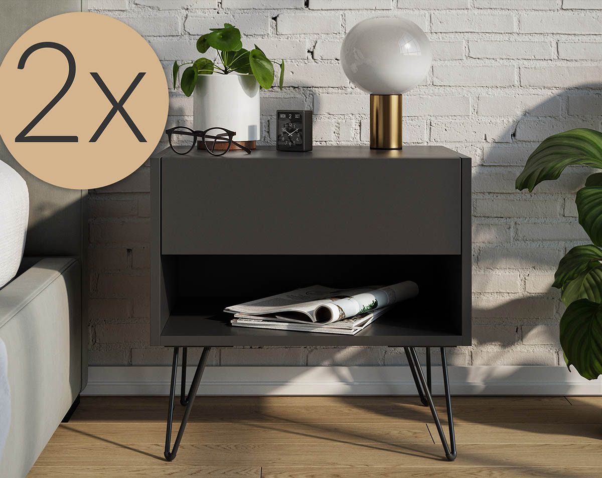 Der Industrial Nachttisch von Posseik kombiniert modernes Design mit praktischer Funktionalität. Die grafitgrauen Softtouch-Fronten verleihen dem Möbelstück eine elegante Optik, während die 20 cm hohen Metallfüße den angesagten Industrial-Stil unterstreichen.