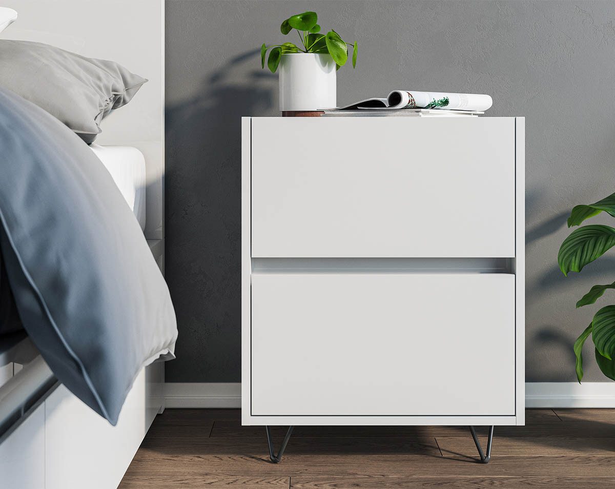 Mit seinen beiden geräumigen Schubladen und der griffloser Soft-Close-Funktion passt der Nachttisch perfekt in moderne Wohnkonzepte. Die klare Linienführung und der Verzicht auf sichtbare Griffe sorgen für ein minimalistisches Erscheinungsbild.