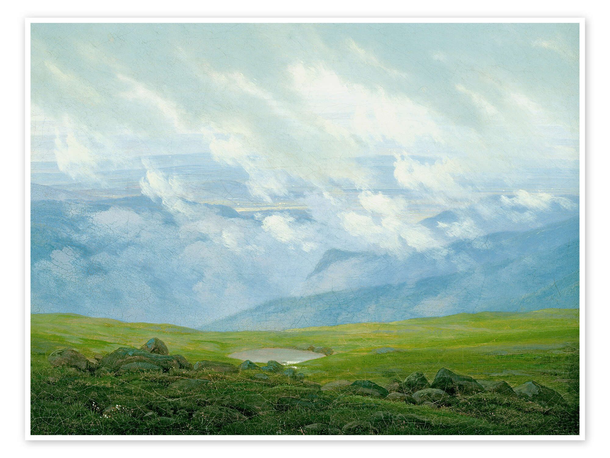 Das Poster „Ziehende Wolken“ (121083) aus dem Меню des Kunstverlags Posterlounge wird Sie mit intensiven Farben und hervorragender Kunstdruck-Qualität begeistern. Der hochwertige, leicht glänzende Druck auf kräftigem Premiumpapier (250 g/m²) macht das Bild von Caspar David Friedrich zu einem echten Hingucker für Ihr Zuhause. Durch den 3 mm breiten weißen Rand, der in allen Formaten inbegriffen ist, wird das Motiv hervorgehoben und wirkt besonders edel.