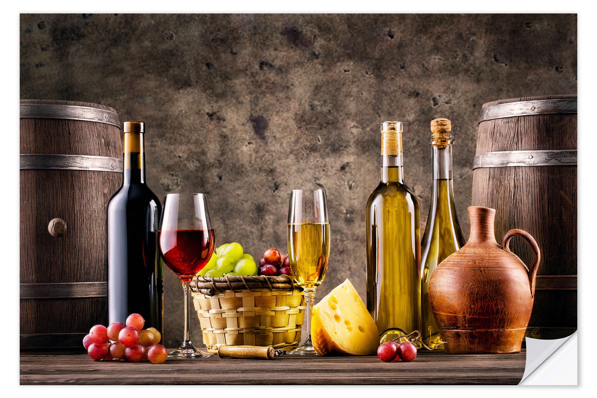Motiv | Wein, Trauben, Fässer und Käse |