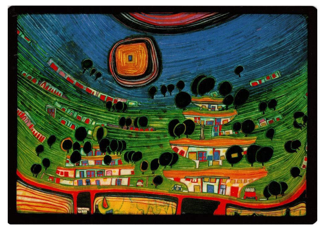 Kunstkarte Hundertwasser "Die Häuser hängen an der Unterseite der Wiesen"