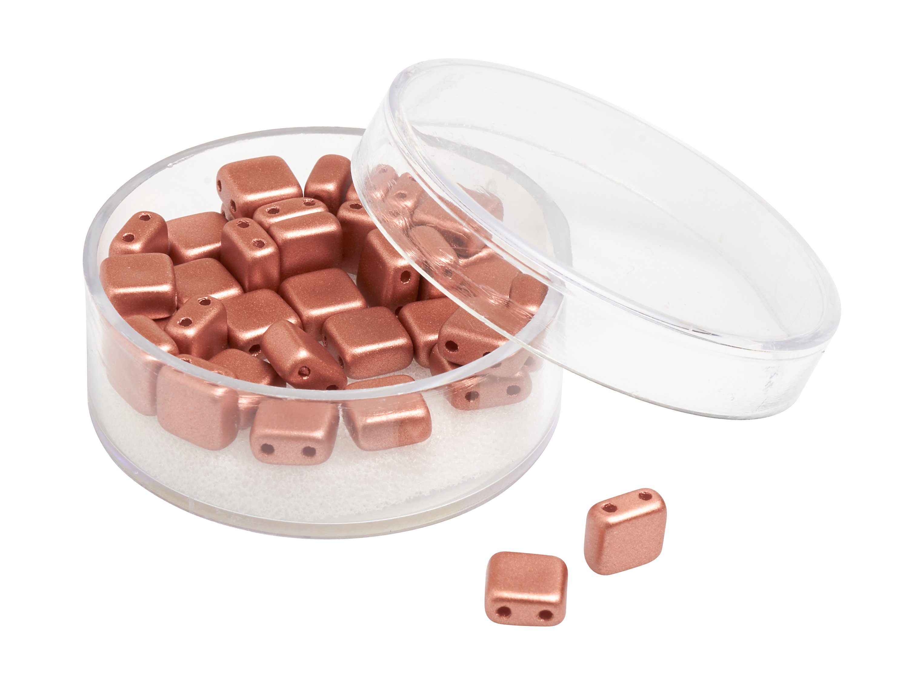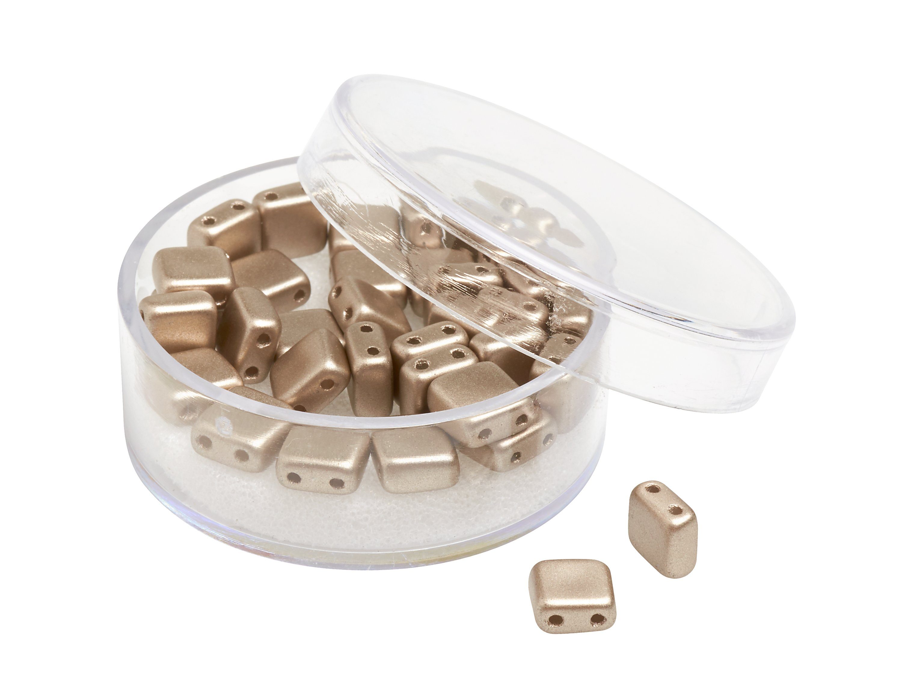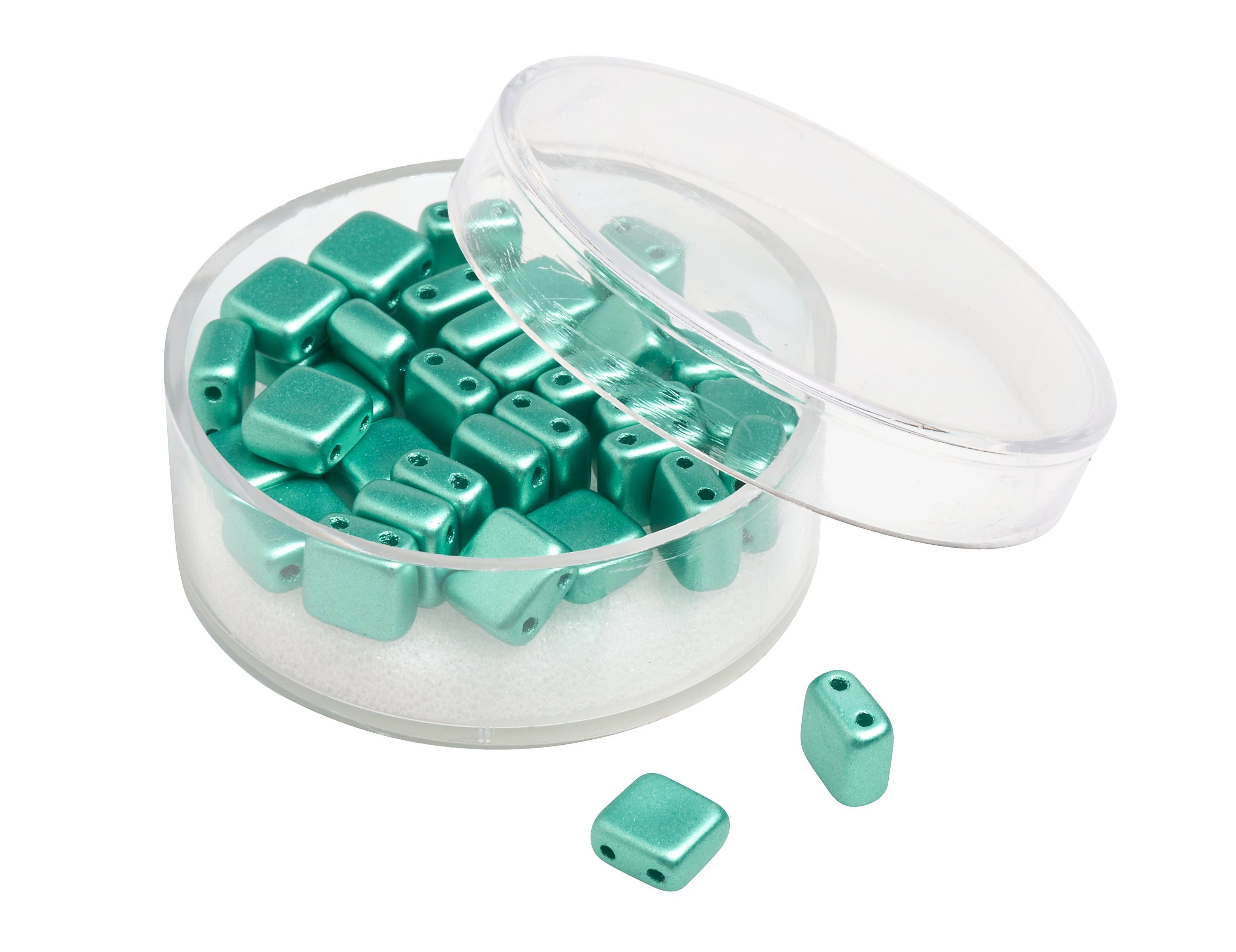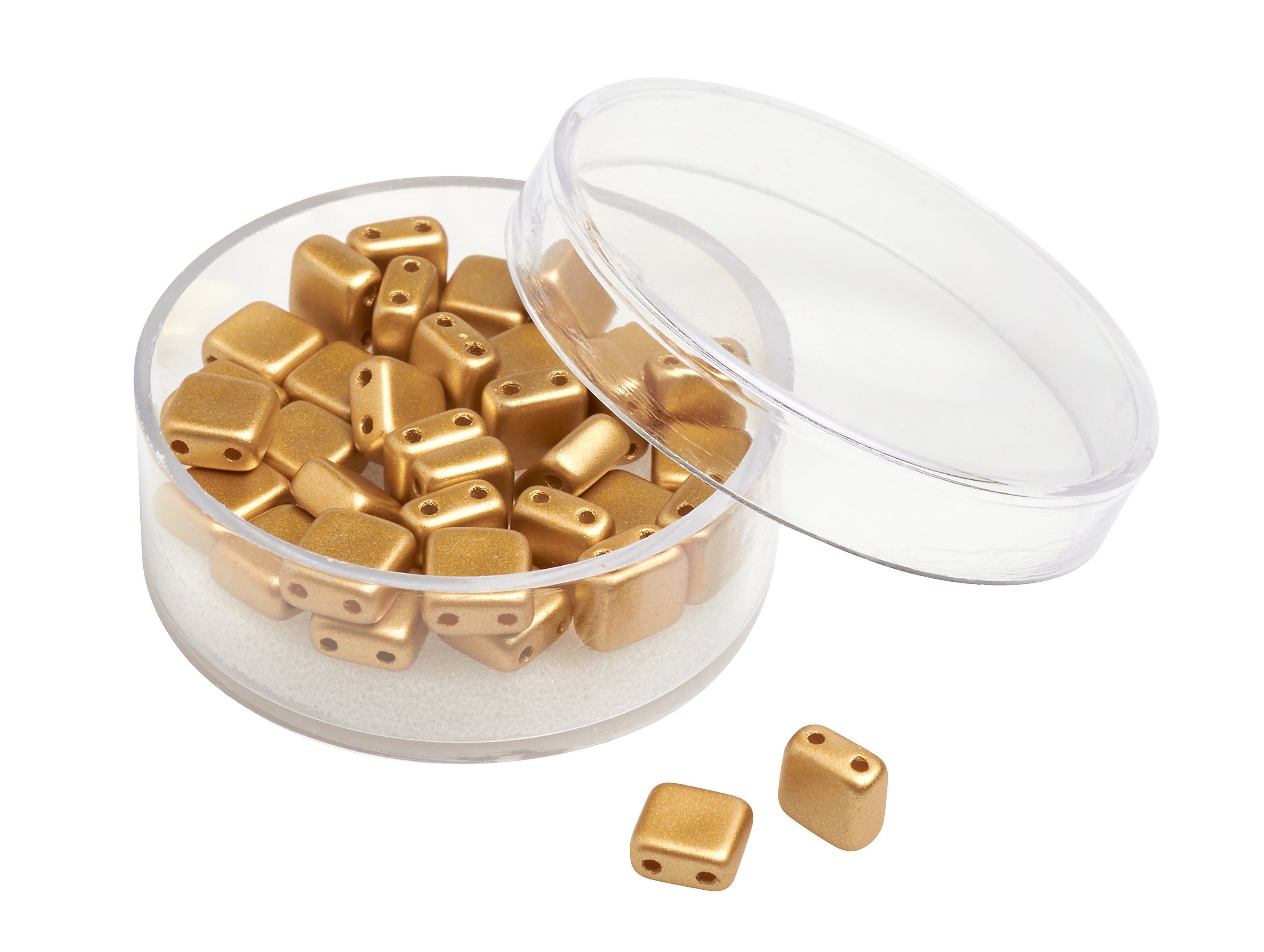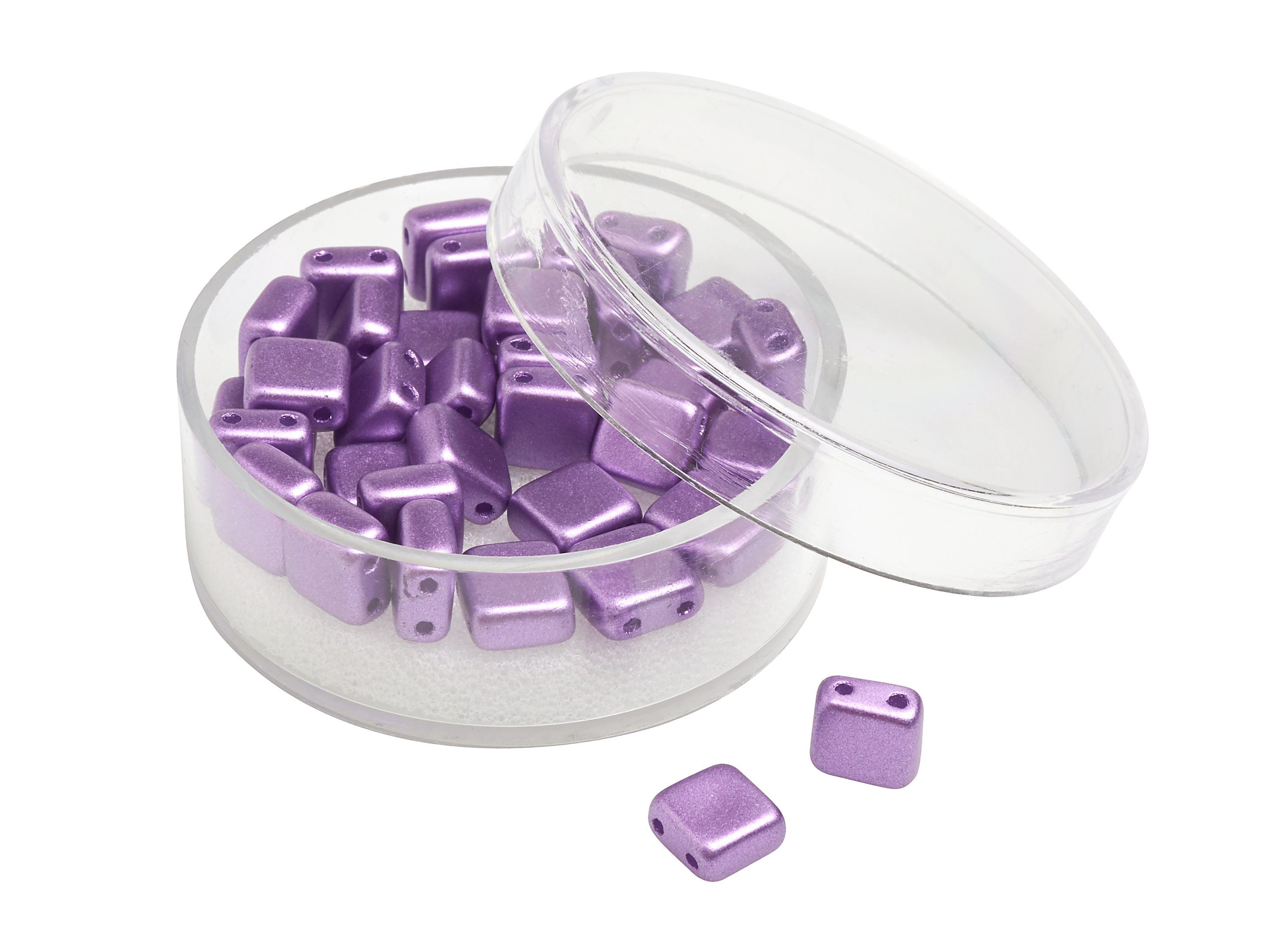 Quadratische 2-Lochperlen aus Glas in Deluxe Qualität und wunderschönen Metallic Farbtönen. Die hochwertigen Perlen verfügen über eine hohe Lichtechtheit, Abriebfestigkeit, Schweißfestigkeit und hohe Resistenz gegen Parfüm. Handwaschbar bis 40 °C. Inhalt: ca. 35 Stück.