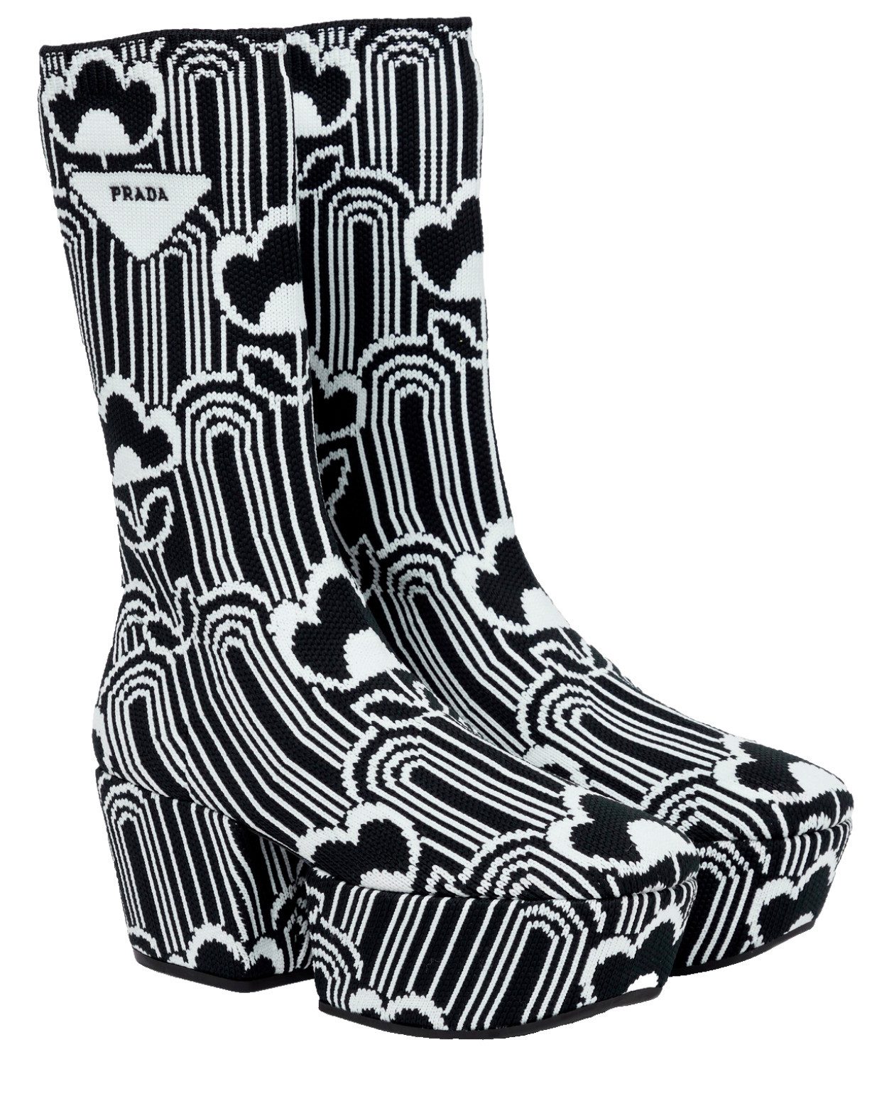 Entdecken Sie die PRADA Floral-Jacquard Plateau-Stiefel, die durch eine geteilte Plateausohle gekennzeichnet sind und einen kühnen grafischen Stil bieten. Diese sockenähnlichen Stiefel weisen ein von den 60er Jahren inspiriertes florales Jacquard-Muster auf und sind mit dem dreieckigen Logo des Hauses verziert. Der Stiefel hat einen Absatz von 3" (76mm) und eine Plateausohle von 2" (Размер 38.5), eine Schaftlänge von 10 3/4" und einen Wadenumfang von 10". Sie sind im Pull-on-Stil gefertigt, mit einem Textilobermaterial und Futter sowie einer synthetischen Sohle. Hergestellt in Italien.