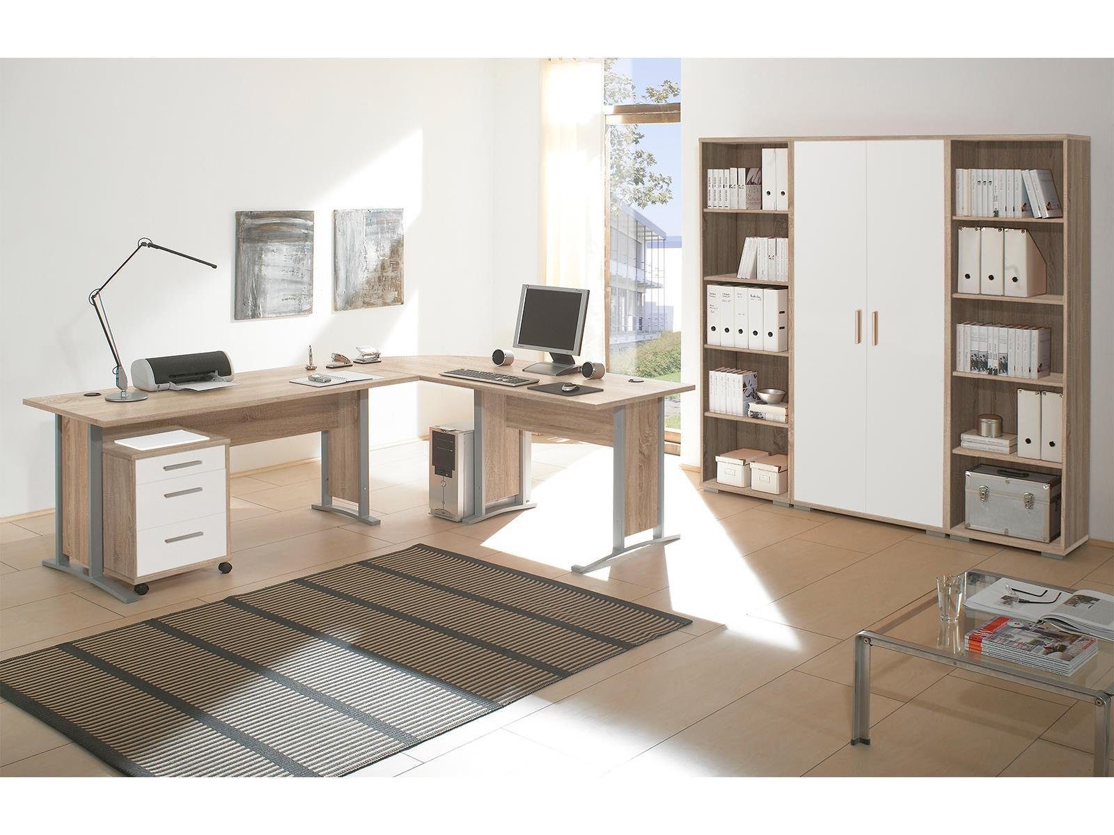 Das Büro-Set "Clermont I" überzeugt nicht nur durch seine attraktive Erscheinung, sondern auch durch sein Stauraumangebot. In 2 Regalen, 1 Aktenschrank und 1 Rollcontainer kann alles, was eben in dem Büro verstaut werden soll, im Handumdrehen sauber und ordentlich verräumt werden. Die großzügigen Schreibtischplatten der Winkelkombination sind mehr als ausreichend groß und erfüllen ihre Aufgabe stets mit Bravour.