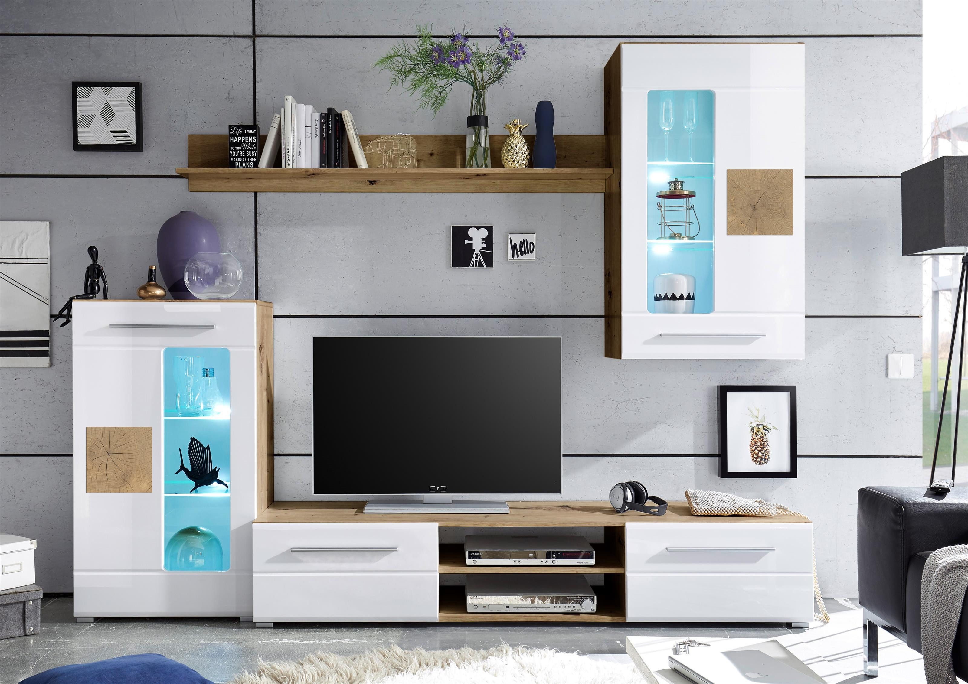 "Goran I" gefällt durch ein kompaktes Maß, das mit mehr als ausreichend Stauraum aufwartet. 1 Vitrine, 1 Hängevitrine, 1 Wandboard sowie 1 TV-Lowboard sorgen hier für den nötigen Platz für TV, Mediageräte, Spielekonsolen, Deko usw.