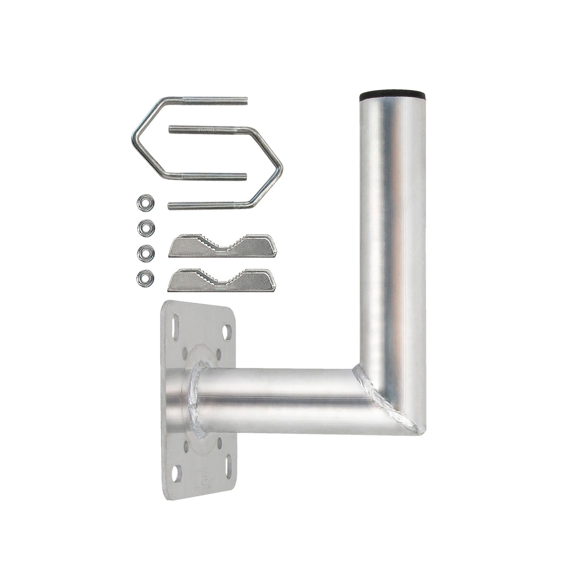 Hochwertige Balkongeländer-Halterung in L-Form aus rostfreien und witterungsbeständigen Aluminium befestigt man eine Satellitenschüssel oder andere Außen-Antennen an einem senkrechten oder waagerechten Rohr. Ideal auch als Rohr-Ausleger für bestehende Masten, z.B. für zusätzliche UKW, LTE, DVB-T, WLAN oder terrestrische Antenne. Zwei robuste Zahnschellen und Bügel aus Stahl lassen sich verdrehsicher vertikal oder horizontal befestigen. Satelliten-Winkelmast universel für die Geländer-Installation oder auch Wandmontage geeignet, die Grundplatte kann durch weglassen der Befestigungsschellen auch direkt an die Wand geschraubt werden. Aluminium-Balkonausleger besticht durch seine Langlebigkeit und Robustheit.