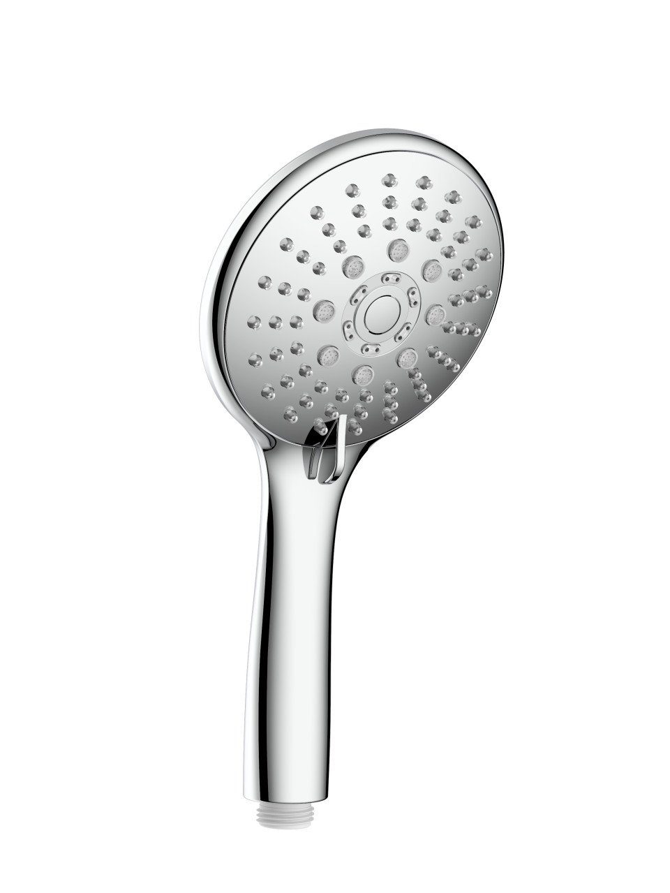 Maße: 25 x Ø 12 cm | Anschluss: 12,7 mm (1/2 ") | 5 Strahlarten (Sprühstrahl, Massagestrahl, pulsierend, Softstrahl, Soft- und Sprühstrahl) | Strahlarten einstellbar durch Drehen | Material: Kunststoff | Form: rund | Farbe: chrom / weiße Strahlplatte | einfache Reinigung, wasser- und energiesparend durch Durchflussmengenregulierer, leicht zu installieren | Lieferumfang: Handbrause |