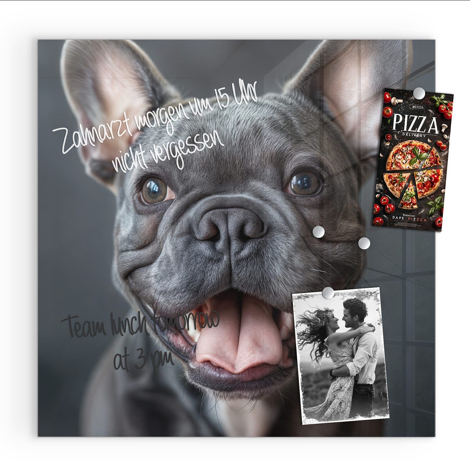 Mit einer Размер von 30x30 cm ist diese Magnetpinnwand mit dem Motiv Lachender Hund die ideale Lösung für Ihre Notizen, Fotos oder als dekoratives Element in Ihrem Zuhause. Die rückseitigen Ausbuchtungen sorgen für einen eleganten Schwebeeffekt, der den Raum optisch aufwertet.