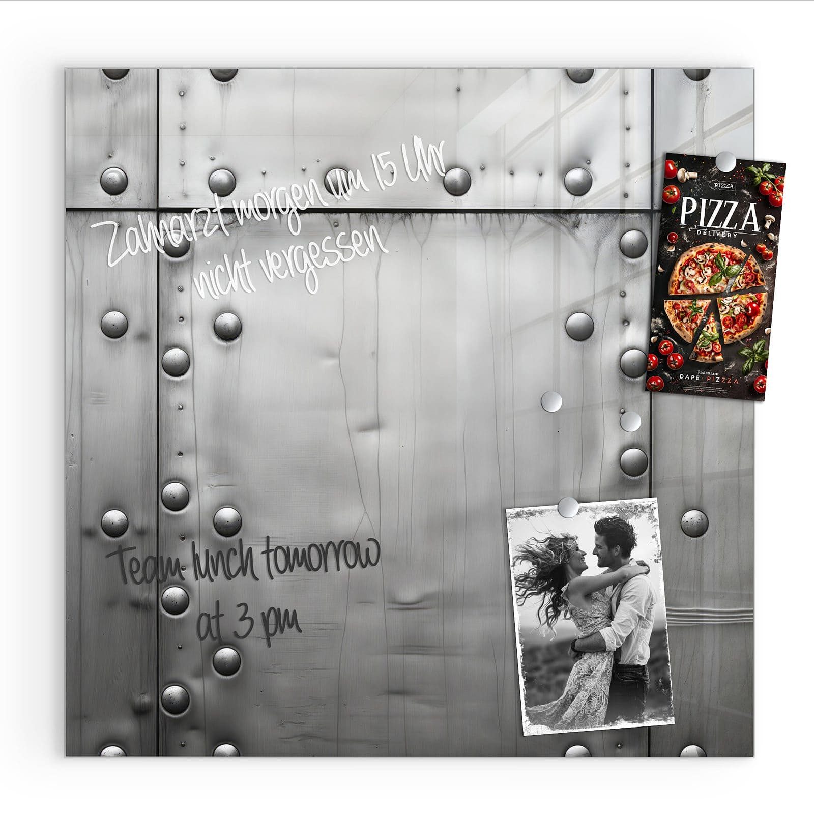 Mit einer Размер von 30x30 cm ist diese Magnetpinnwand mit dem Motiv Metallplattenoptik die ideale Lösung für Ihre Notizen, Fotos oder als dekoratives Element in Ihrem Zuhause. Die rückseitigen Ausbuchtungen sorgen für einen eleganten Schwebeeffekt, der den Raum optisch aufwertet.