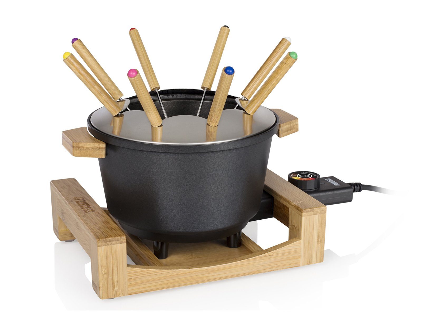 Ausstattung | Regelbarer Thermostat mit Einteilung in Schokofondue, Käsefondue, Brühe und Öl Abnehmbares Kabel mit Thermostat |