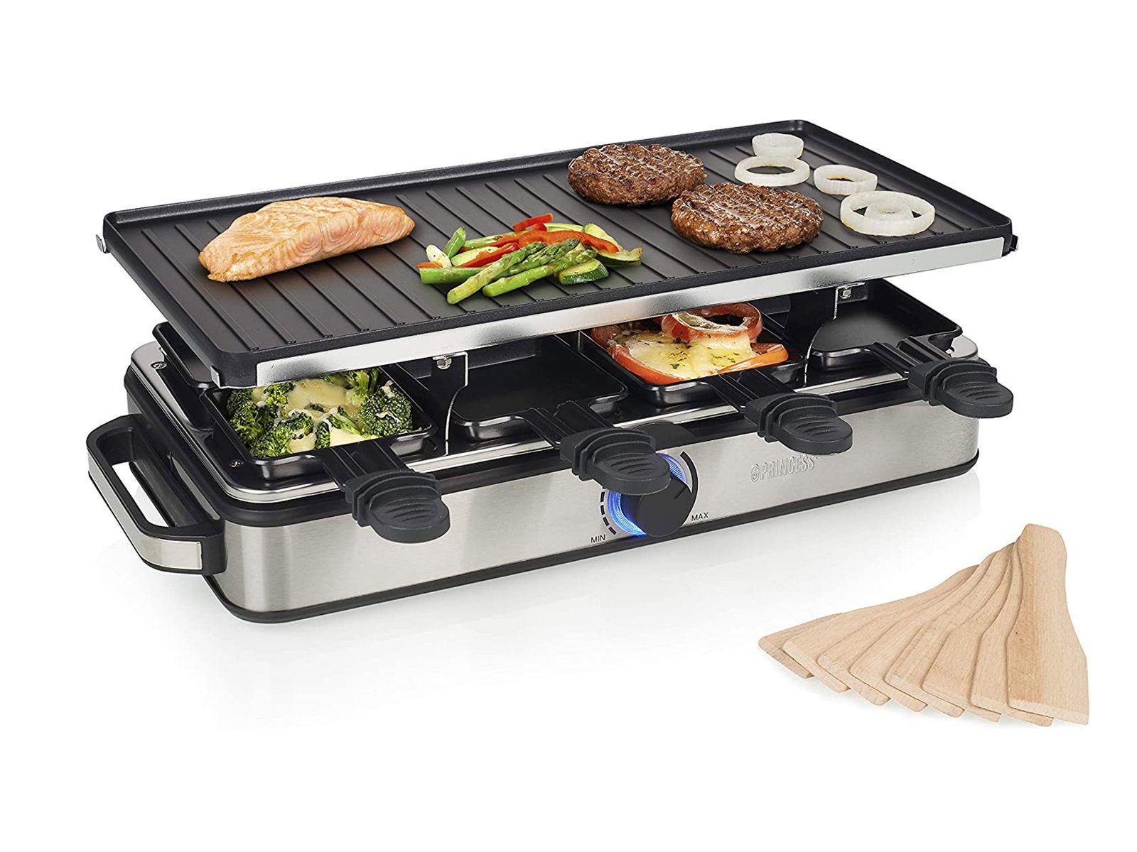 Top-Features | Die besonders lange Form des Raclette Gerätes sorgt dafür, dass jeder am Tisch das Raclette erreichen kann Die wendbare Griddleplatte hat eine glatte und eine geriffelte Seite, so dass Sie zwischen Grill-, Teppanyaki- und Raclette-Funktion wählen können. |