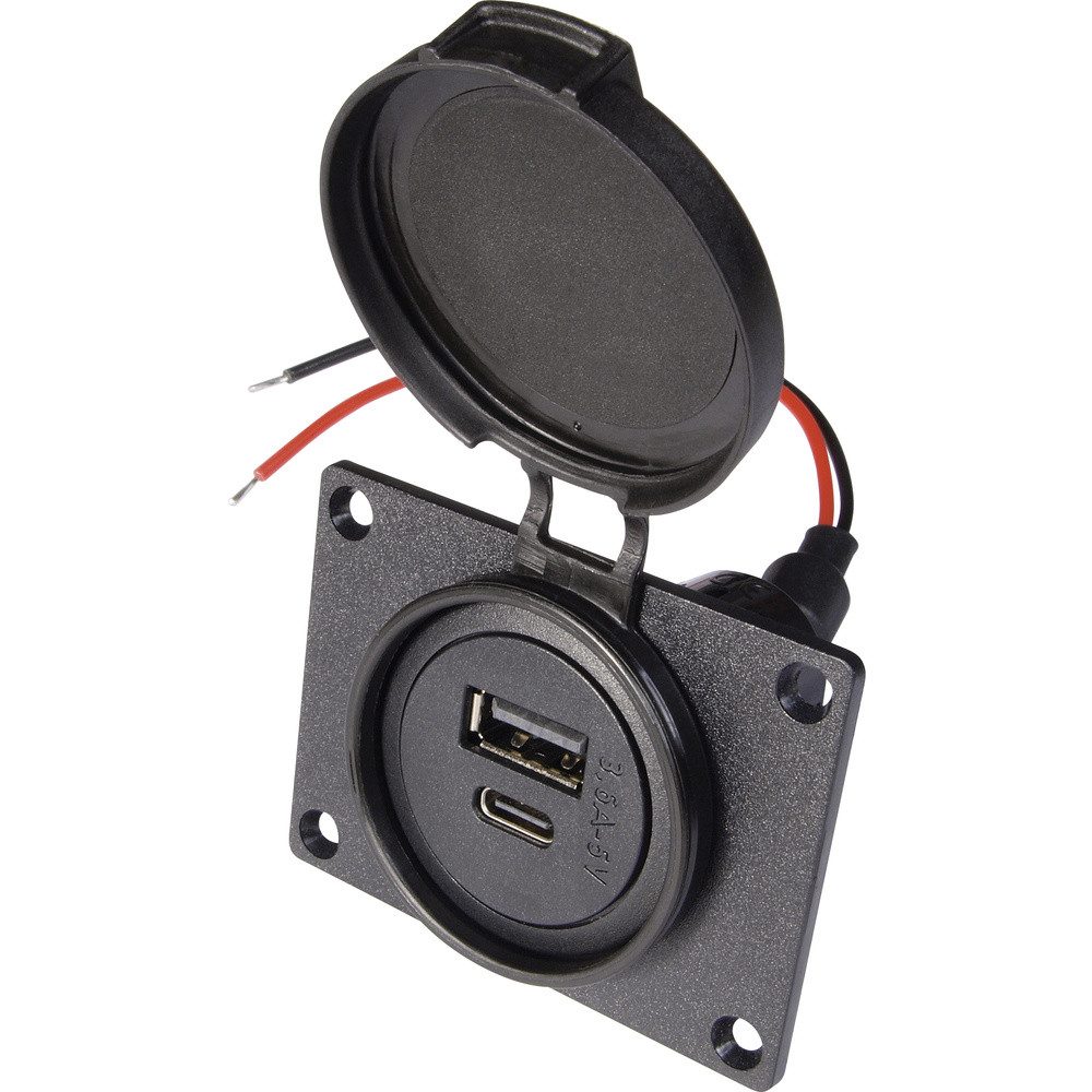 12-24 Volt Power USB-C/A Doppelsteckdose mit Schutzdeckel IP 54 zum Laden und Betreiben elektronischer Geräte, die über 5 V USB geladen werden können. Kabelanschluss ca. 150 mm, 2 x 0,5 mm², Einbaumaß Ø 36 mm, Befestigung mittels beiliegender Schrauben. Ausgang 5 V, 3,6 A, Eigenverbrauch unter 1 mA