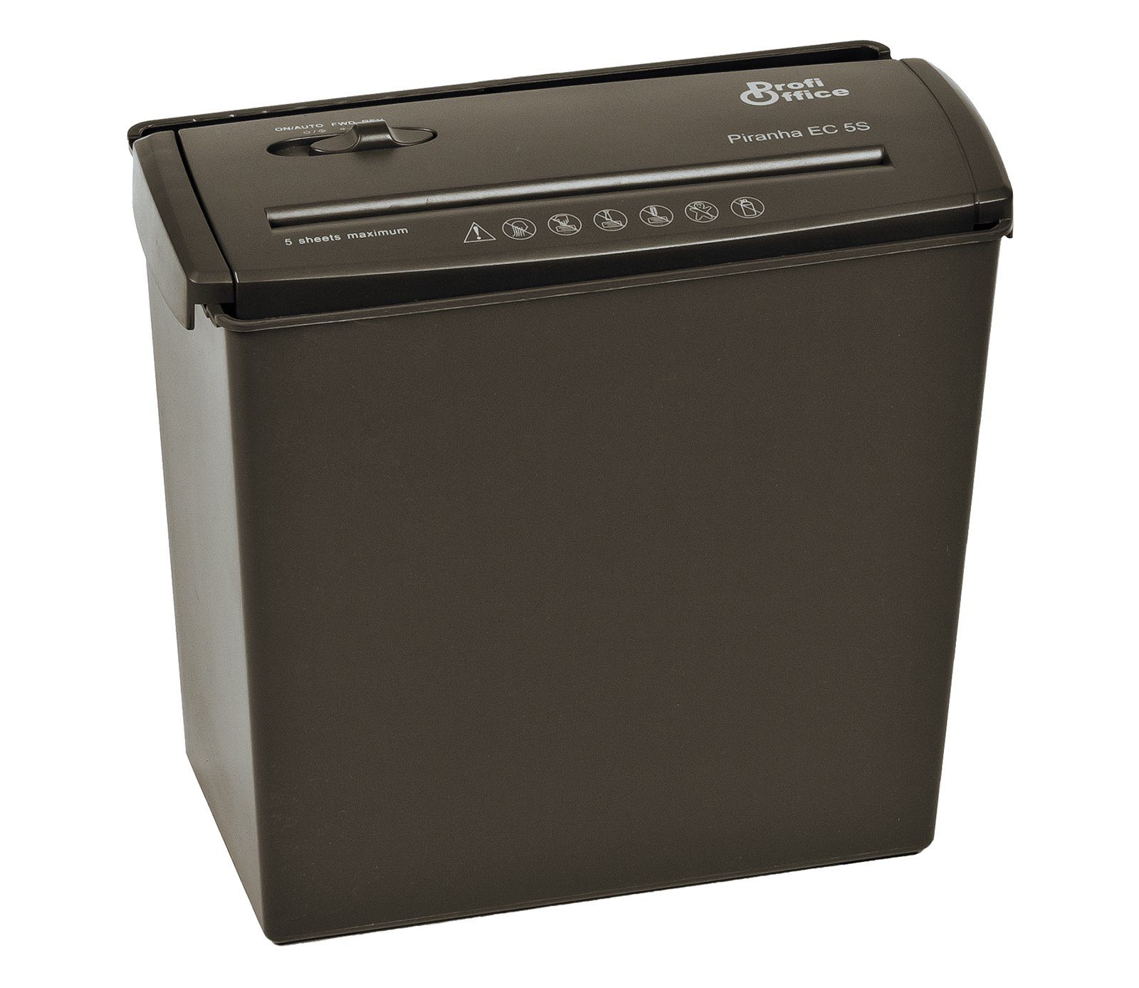 Streifengröße (mm) 6,8Kapazität (80 g/qm)5 BlattSchnittbreite (mm)220Geschwindigkeit m/min3,8Papierkorb (l)10SchalterAuto / On / Off / RevLaufrichtungmanuell/autoMotor (Watt)140ÜberhitzungsschutzjaSicherheitsstufe2Heft/Büroklammern ja/neinCDs und DVDs neinMaße300 x 162 x 280Gewicht (kg)1,6Der Piranha EC5S ist für das Home Office gedacht, für das gelegentliche vernichten von Unterlagen zu Hause. Der Aktenvernichter vernichtet bis zu 5 Blatt mit einer Grammatur von 80 g/m², geheftet oder nicht geheftet. Das geschredderte Papier wird in 6,8 mm breite Streifen geschnitten. Die maximale Einsatzzeit am Stück beträgt 2 Minuten. Danach muss er 15 Minuten lang abkühlen. Der Geräuschpegel beträgt maximal 69 dB und die Papierkorbkapazität 10 Liter. Der Schredder verfügt außerdem über eine Start-Automatik, manuelle Vor-und Rücklauffunktion und einen Überhitzungsschutz. Durch abheben des Schneidekopfes können Sie den Papierkorb leeren. Всеs damit Ihre Daten sicher bleiben und kein Datenklau passieren kann.