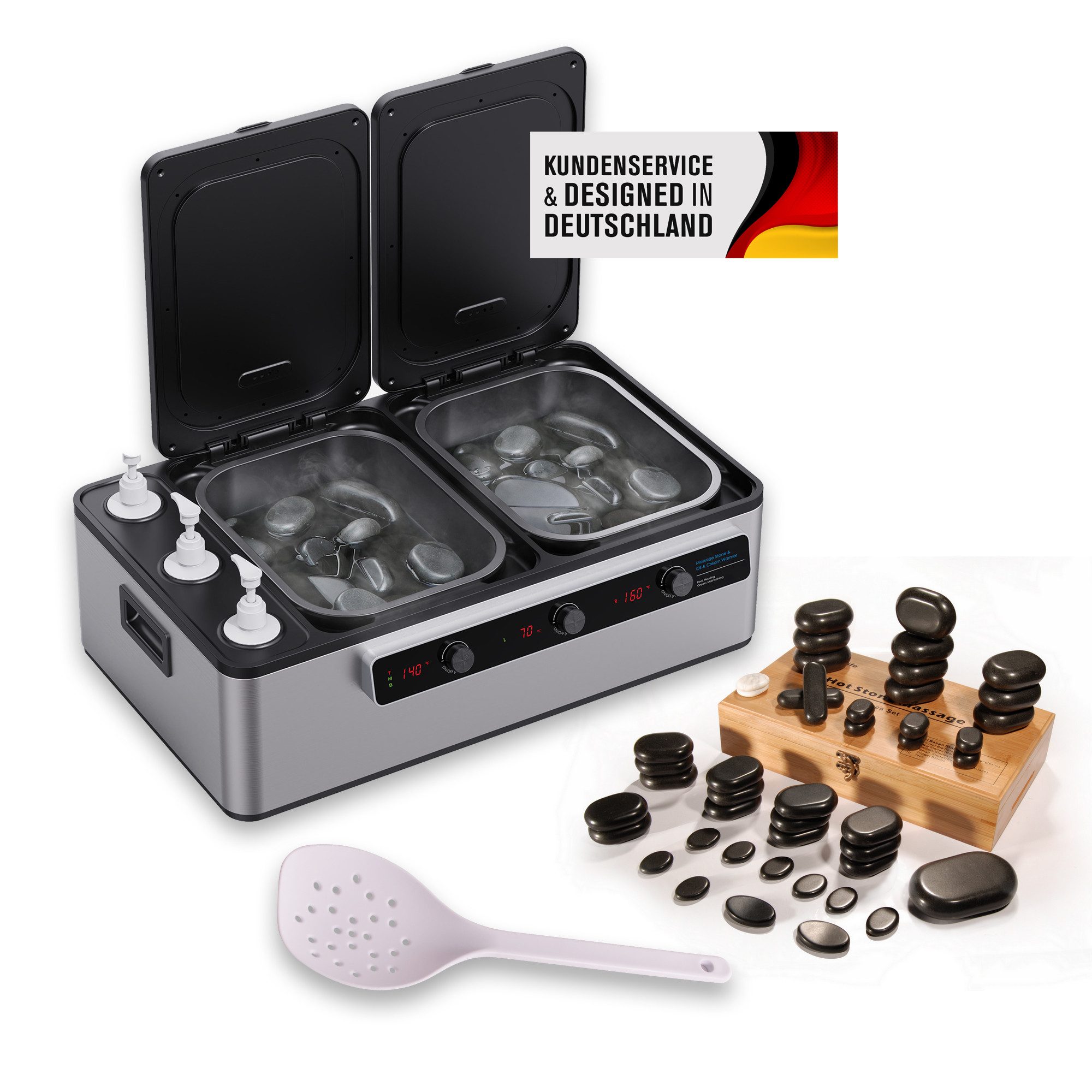 Dank der professionellen Bauweise mit zwei separaten beheizten Zonen für die Massagesteine (jeweils 4,5 Liter) und drei Zonen für Massageöl genießen Sie maximale Flexibilität bei der Anwendung. Die fortschrittliche Heiztechnologie ermöglicht ein schnelles Aufheizen in nur 15–20 Minuten, sodass Sie nie wieder lange warten müssen, um die optimalen Temperaturen für Ihre Massagetherapie zu erreichen.