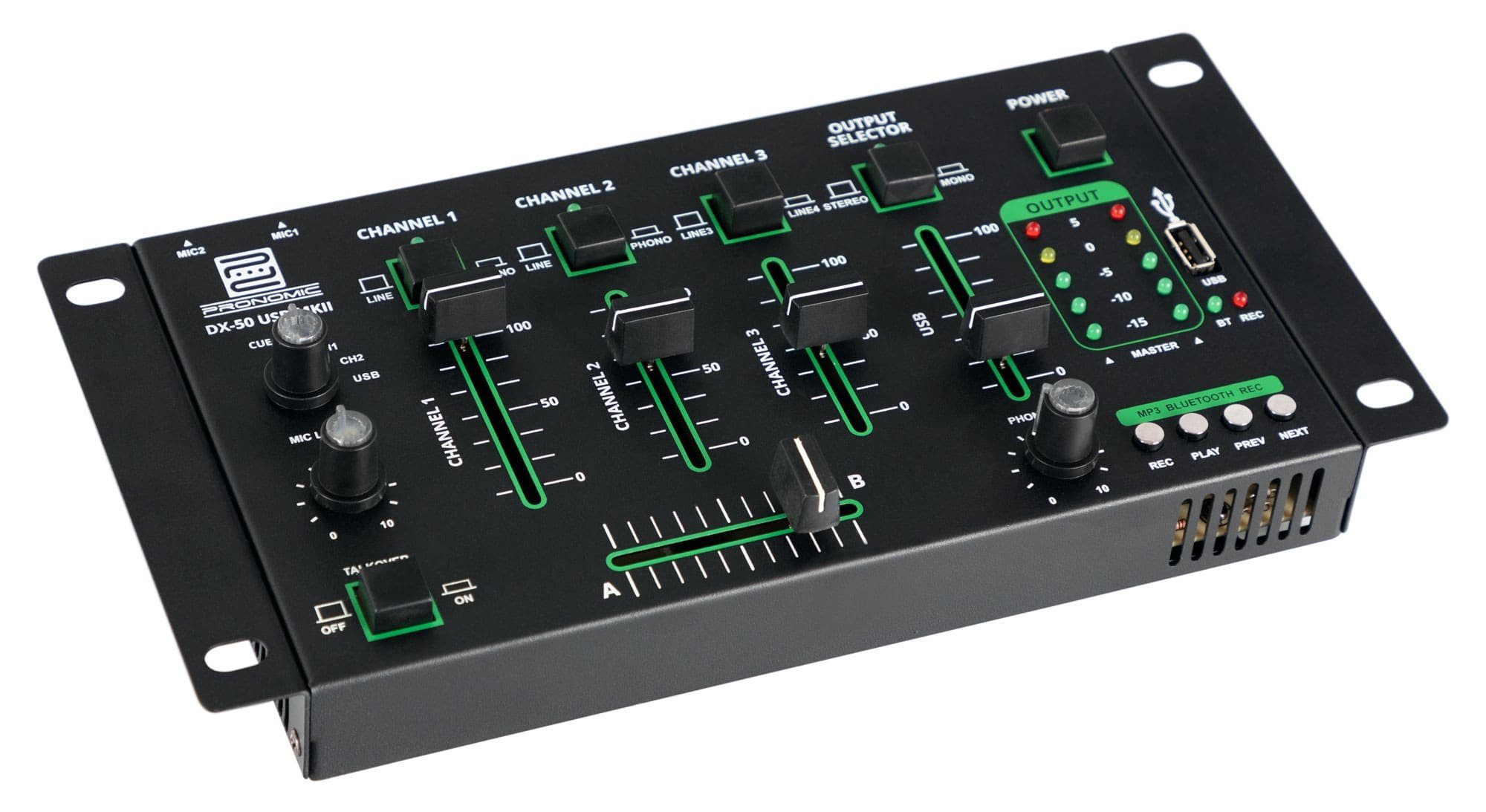Der DX-50 USB MKII bietet zunächst vier Line-Kanäle, von den sich zwei auf Phono-Kanäle umschalten lassen. Все Kanäle können in der Lautstärke geregelt werden und die Kanäle 1 und 2 lassen sich per Crossfader überblenden. Der 3. Kanalzug ist für die Regelung der Kanäle 3 und 4 zuständig (umschaltbar). Ein weiterer Kanal des DX-50 USB MKII steht für den eingebauten USB-Player und die Bluetooth®-Verbindung zur Verfügung.