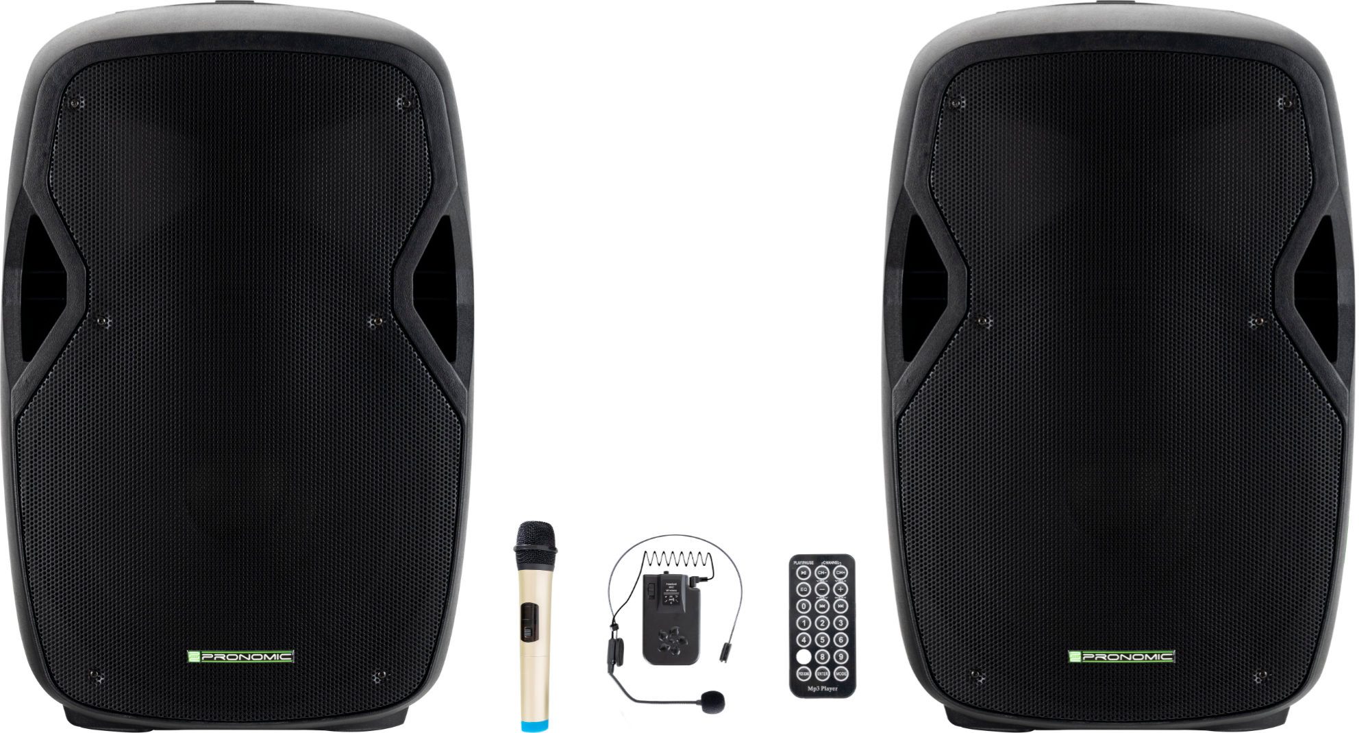 Lieferumfang | 2 x Pronomic MOVE 15MA-A Akku Aktivbox 2 x Handsender-Funkmikrofone 2 x Headsets mit Taschensender 2 x Fernbedienung 2 x Netzkabel |
