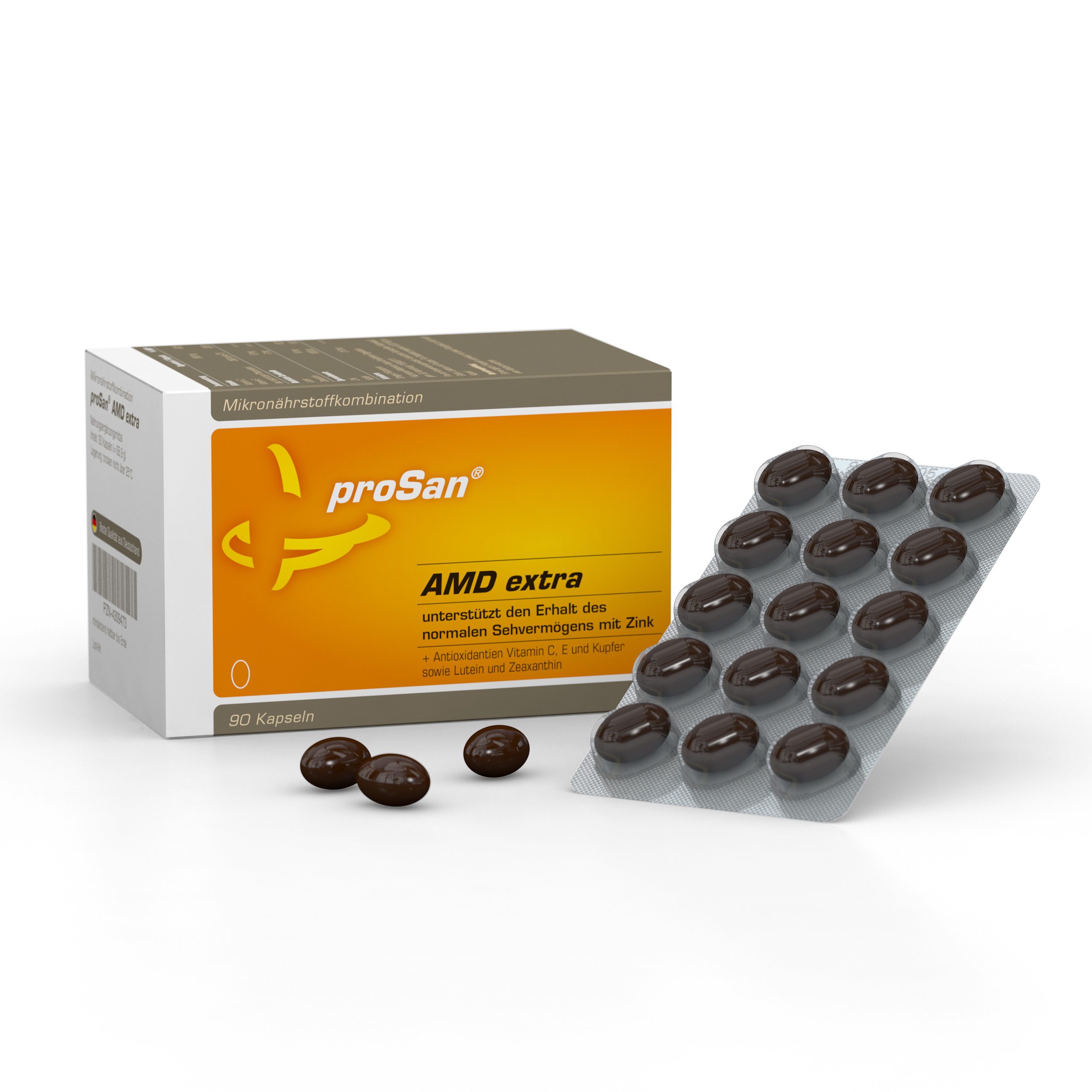 Zusätzliche Angaben | proSan AMD extra ist frei von Konservierungsmitteln, künstlichen Farbstoffen, Milcheiweiß, Gluten, Laktose und Fructose. Für Diabetiker geeignet (0,013 BE pro Kapsel). |
