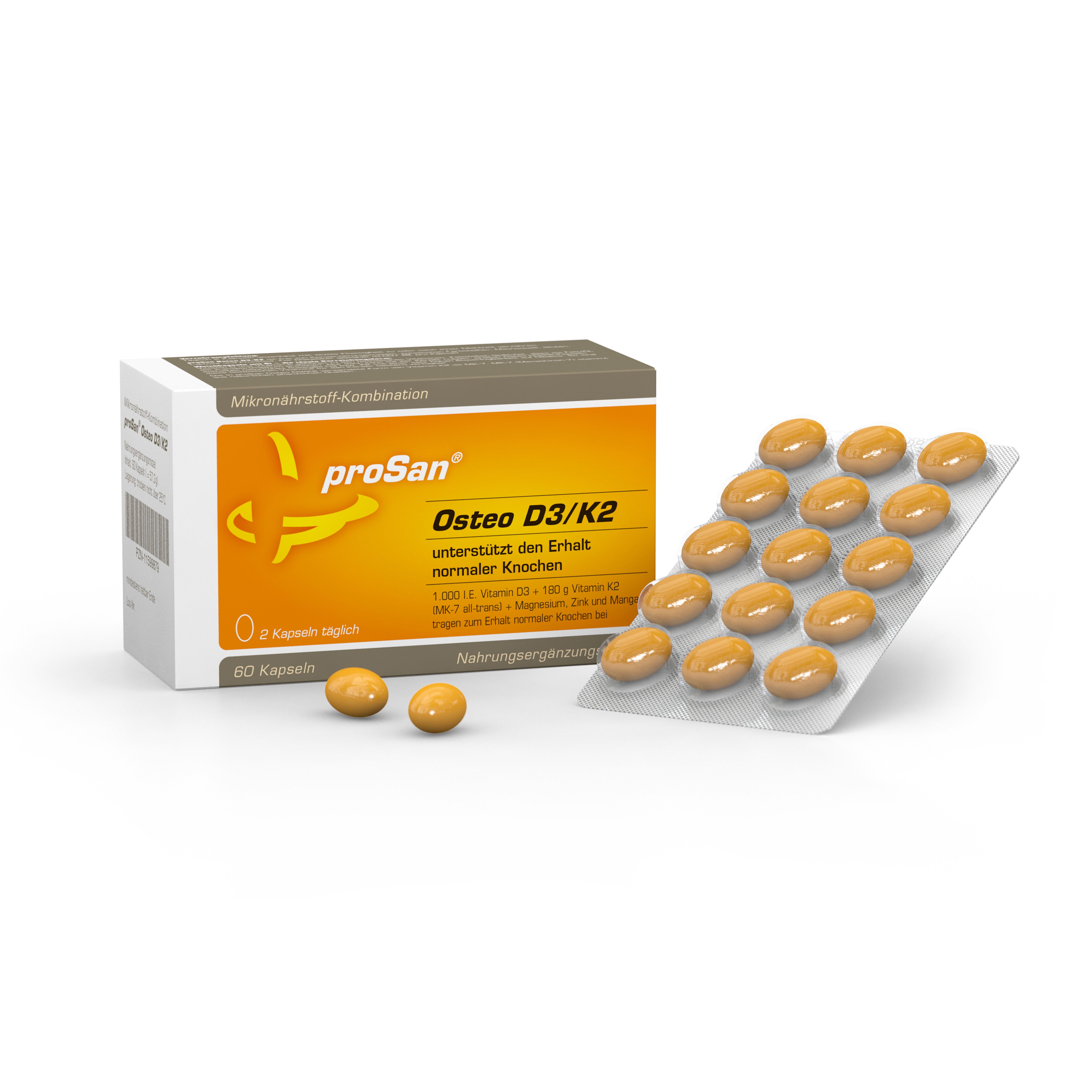 Das Besondere an proSan Osteo D3/K2 Forte ist die Kombination von 1.000 bzw. 4.000 I.E. Vitamin D3 mit Vitamin K2, Calcium und Magnesium. Zur Ernährung der in den Knochen vorhandenen Zellen (Knochenstoffwechsel) und damit auch für die Knochendichte sind genau diese 4 Mikronährstoffe von zentraler Bedeutung: