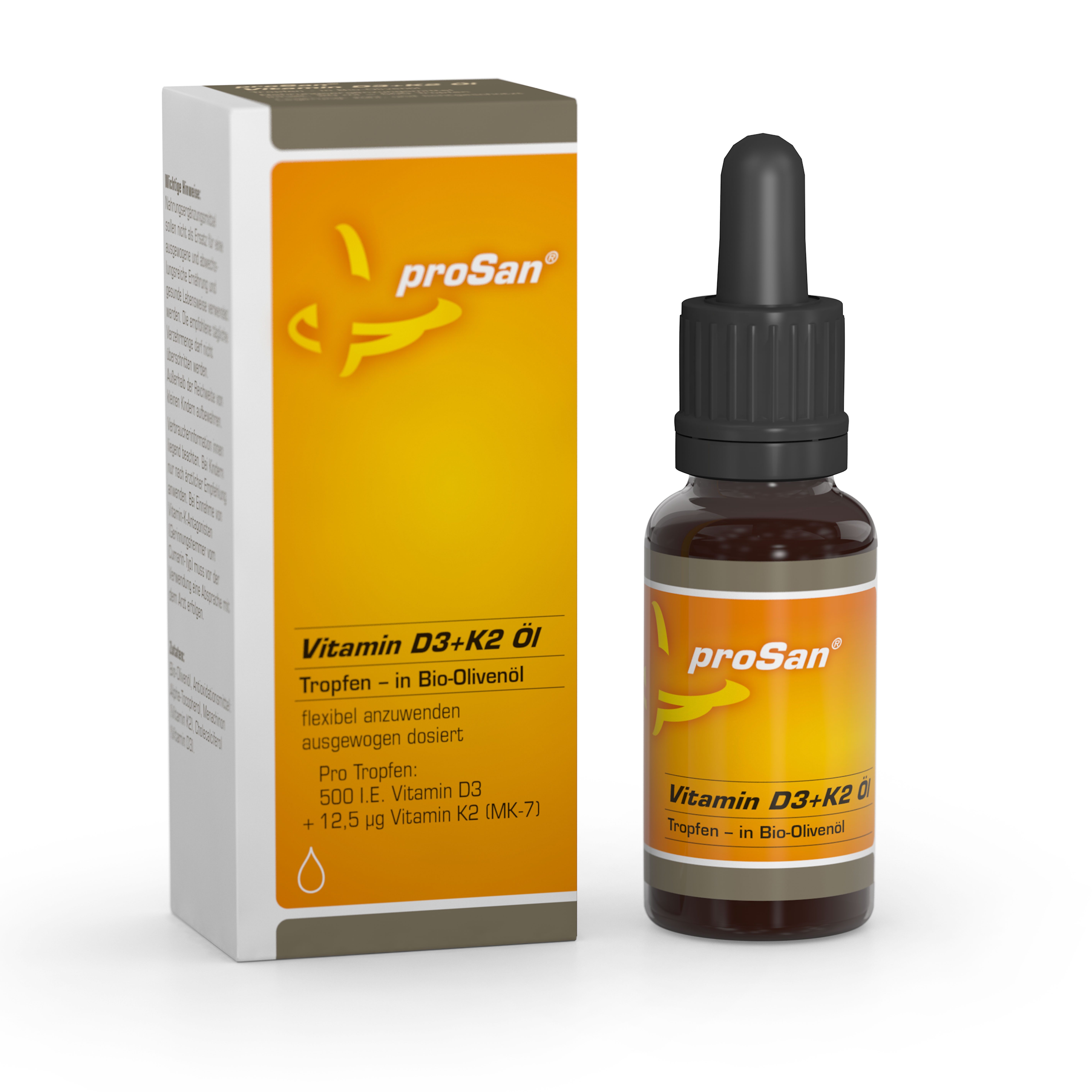 Das Besondere an proSan Vitamin D3+K2 Öl ist die Kombination mit Vitamin K2. Als Nahrungsergänzung sollte gerade hoch dosiertes Vitamin D3 immer zusam-men mit Vitamin K2 eingenommen werden, da sich die beiden Vitamine in ihren Funktionen für den Organismus sinnvoll ergänzen.