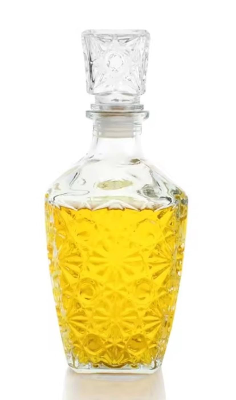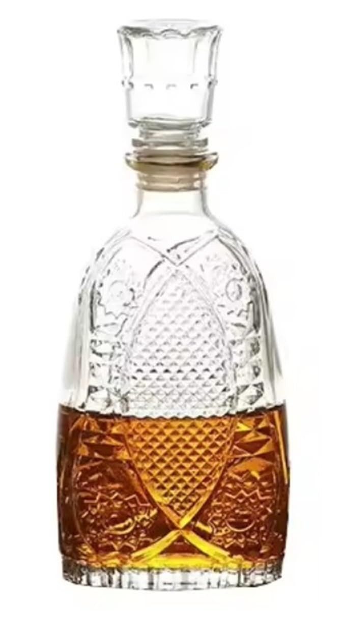 Dekorative Glas-Karaffe in klassischem Design mit schwerem Glasverschluss. Die Glaskaraffe eignet sich für Whiskey, Cognac, Scotch, Brandy, Sherry u.v.w. alkoholische Getränke. Mit spürbaren Konturen überzeugt die Haptik der Karaffe auf ganzer Linie. Das Fassungsvermögen der Whiskey-Karaffe beträgt ca. 800 bzw. 900 ml. Der schwere Glasverschluss lässt sich einfach auf die Karaffe stülpen und sorgt für einen festen Verschluss.