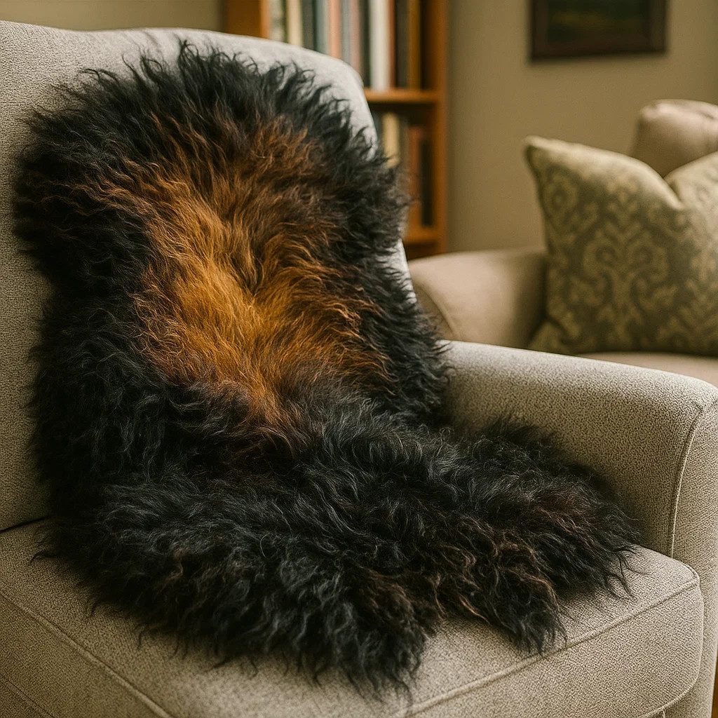 Unser ökologisch gegerbtes Islandschaffell bringt Wärme und Stil in Ihr Zuhause. Es eignet sich perfekt als Dekoration für Sofa, Sessel, Bett oder Boden. Die langen, zotteligen Fasern und die ausdrucksstarke Naturfarbe in Schwarz-Gold machen jedes Fell zu einem Unikat mit Charakter.
