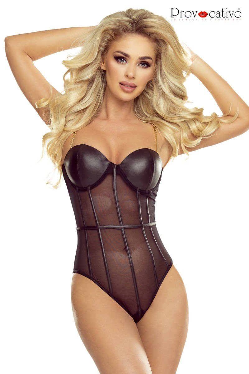 Body, gefertigt aus feinem Netzmaterial und glattem Wetlook Stoff. Goldene Metallkette als Träger. Die gepolsterten Cups haben Bügel. Druckknopfverschluss im Schritt. Der Artikel ist in einer Hochglanzbox verpackt. Pflegehinweis : 30Grad Handwäsche Farbe : schwarz Material : 90% Polyamid / 10% Elasthan erhältliche Größen : S/M, L/XL