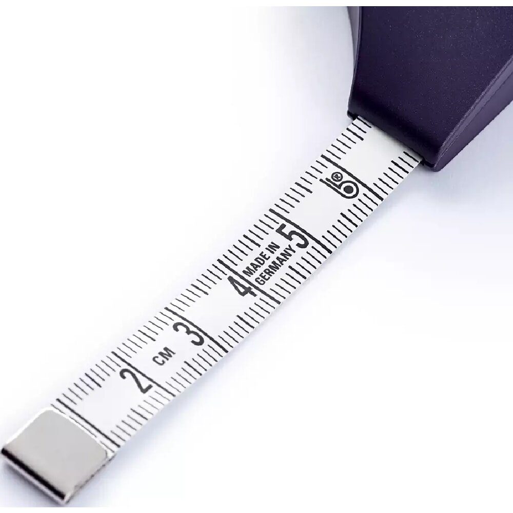 Das Rollmaßband mit ergonomischem Design. Das Gehäuse liegt mit der unteren Seite flach auf dem Tisch und ermöglicht ein präzises Messen. Das weiße 0,3 mm starke Band ist mit einer Skala in Zentimetern bedruckt und hat eine Длина von 150 cm. Eine Rückhaltemechanik hält das Bandmaß während der Arbeit in der gewünschten Position.