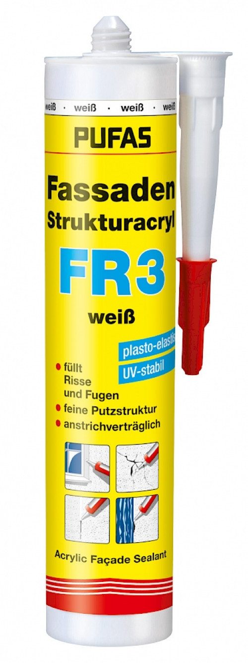 PUFAS Fassaden-Strukturacryl FR3 eignet sich hervorragend zum Füllen von Anschlussfugen und Rissen zwischen allen mineralischen Untergründen (wie z.B. Beton, Putz und Mauerwerk) sowie Dispersions- und Fassadenfarben, mineralischen und Kunstharzputzen und für strukturierte Anschlussfugen an Fenster, Türen u. ä. Durch seine leicht körnige Struktur passt sich der Dichtstoff hervorragend an die Putzoptik an. Nach Aushärtung ist das Material witterungsbeständig.