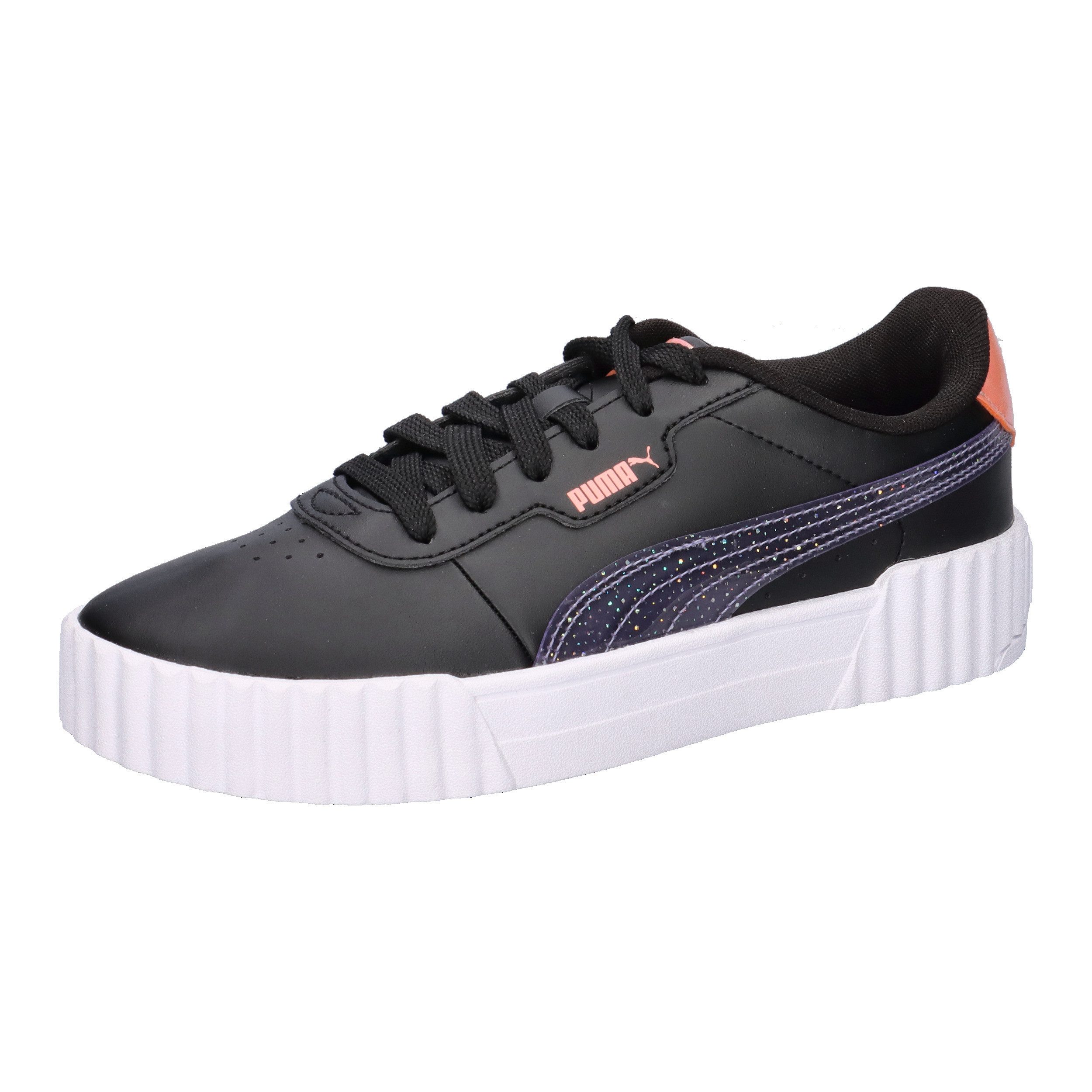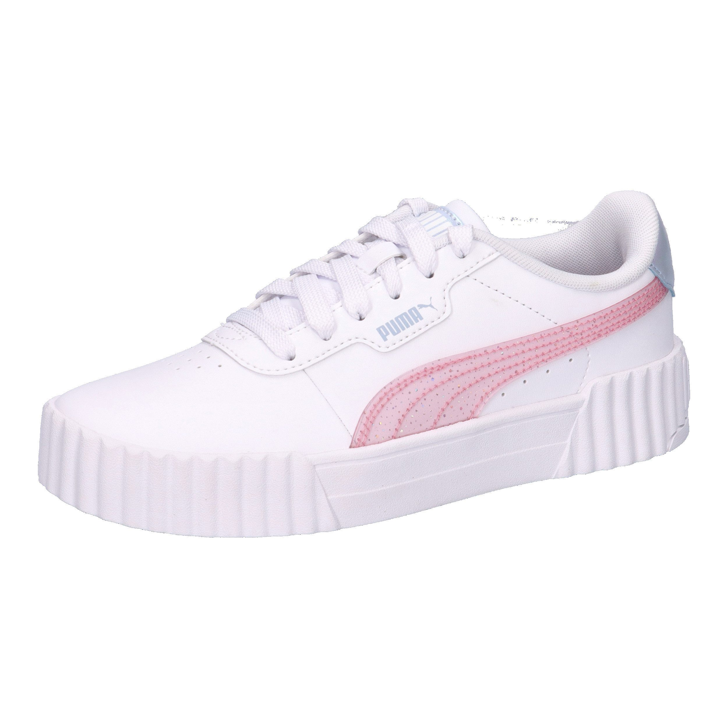 Puma Kinder Sneaker Carina 3.0 Blurry Dreams Jr. Inspiriert von der Tennisästhetik, umarmt dieser Schuh die Weiblichkeit für ein klassisches Modell. Mit seinem Obermaterial aus Leder und hochwertigem Synthetikleder und dem Softfoam-Fußbett ist dieser Schuh eine perfekte Mischung aus Komfort und Modernität. Die Softfoam+ Einlegesohle sorgt für hervorragende Dämpfung und optimalen Komfort bei jedem Schritt des Tages. Dieses Paket bietet einen surrealen, verträumten Vibe mit kaum sichtbaren Prints und einer floralen Farbpalette. Mit einer Aquarelltechnik werden weiche Farbverläufe erzielt, die durch perlmuttartige Details, durchscheinende Überlagerungen und einen Hauch von Glitter noch verstärkt werden. Obermaterial: Synthetik Leder Sonstiges Material, Futter und Decksohle: Textil, Laufsohle: Sonstiges Material.