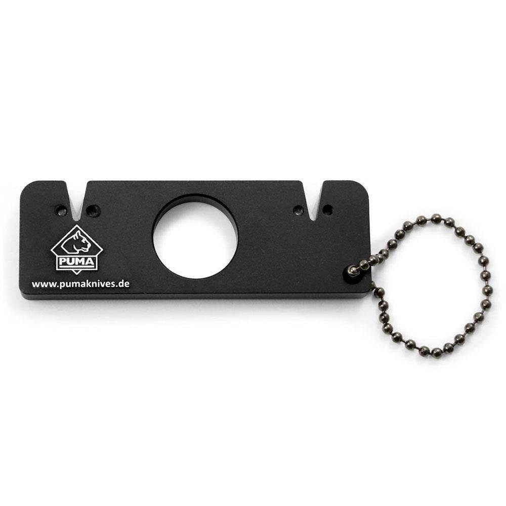 Das PUMA Schärfinstrument ist geeignet für kleine sowie mittelgrosse Klingen und kann aufgrund seiner kompakten Maße auch im Jagdbetrieb und Outdoorbereich immer dabei sein. Für die praktische Anwendung stehen zwei Durchziehausnehmungen zur Verfügung. Diese bestehen jeweils aus einem zweiteiligen Winkeleinsatz, für den Grobschliff aus gehärtetem Stahl und für den Feinschliff aus Keramik. Der Messerschärfer ist ein Qualitätsprodukt und aus hochwertigem, schwarz eloxiertem Aluminium gefertigt. Eine kleine Kugelkette sowie eine schöne Einstecktasche mit PUMA-Logo sorgen für den sicheren Transport. Eine anschauliche Bedienungsanleitung gehört ebenfalls zum Lieferumfang.