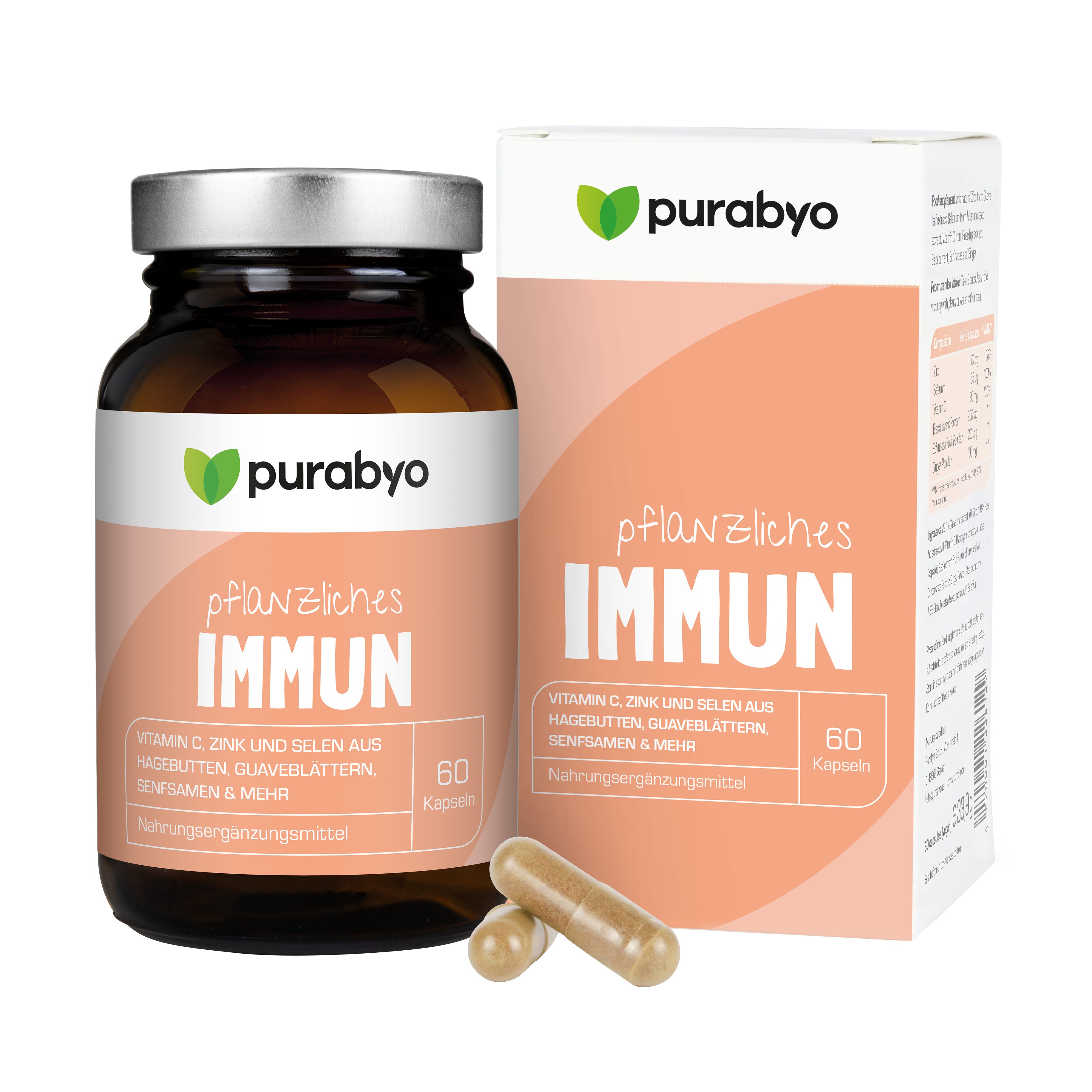 Die Kraft der Pflanzen... Purabyo Immun enthält rein natürliche, pflanzliche Zutaten wie Vitamin C aus Hagebutte, Zink aus Guavenblatt und Selen aus schwarzen Senfsamen. Впередe Zutaten wie Echinacea Saftkonzentrat, Schwarze Johannisbeere und Ingwer liefern zusätzliche Anthocyane, Scharfstoffe und Öle. Das leistet Purabyo Immun für dein Immunsystem Die in Purabyo Immun enthaltenen Spurenelemente und Vitamine für das Immunsystem sind: Vitamin C, Selen und Zink. Sie tragen ganz wesentlich zu einer normalen Funktion deines Immunsystems bei! Vitamin C trägt zur Verringerung von Müdigkeit sowie zu einem normalen Energiestoffwechsel bei. Selen, Zink und Vitamin C schützen deine Körperzellen vor oxidativem Stress. Ingwer, Echinacea und Schwarze Johannisbeeren runden die Rezeptur ab. Purabyo Immun ist vegan, GMO frei, gluten- und lactosefrei. Die Kapseln bestehen aus pflanzlicher Cellulose anstelle tierischer Gelatine. Was uns wichtig ist Purabyo-Produkte enthalten keine isolierten Vitamine, Mineralstoffe und andere Mikronährstoffe. Statt dessen liegen sie in organisch gebundener Form vor. Purabyo-Produkte liefern Vitamine und Mineralstoffe somit im natürlichen Verbund einer Pflanzenmatrix, getrocknet oder konzentriert. Dadurch sind Begleitstoffe wie sekundäre Pflanzenstoffe und damit mögliche Synergieeffekte vorhanden. Auch die Verpackung ist uns in Zeiten der steigenden Verschmutzung der Ozeane mit Plastikmüll wichtig. Wir füllen unser Purabyo Immun daher in stabilen, lichtgeschützten Braunglasflaschen ab. Etikett, Faltkarton und Beipackzettel sind auf umweltfreundlichem Papier oder Recyclingpapier gedruckt. Das Papier stammt aus verantwortungsvoller Holzwirtschaft, was durch den FSC (Forest Stewardship Council) bestätigt worden ist. Über uns Purabyo hat seinen Sitz im Münsterland, einer von der Natur und Landwirtschaft geprägten Region. Gegründet von diplomierten Ernährungswissenschaftlern entwickeln wir Naturprodukte nach hohen Qualitätsstandards, frei von tierischen Inhaltsstoffen, in möglichst ressourcensparender Verpackung. Als Familienunternehmen stellen wir ausschließlich Produkte aus natürlichen Inhaltsstoffen her, hinter denen wir mit gutem Gewissen stehen können.