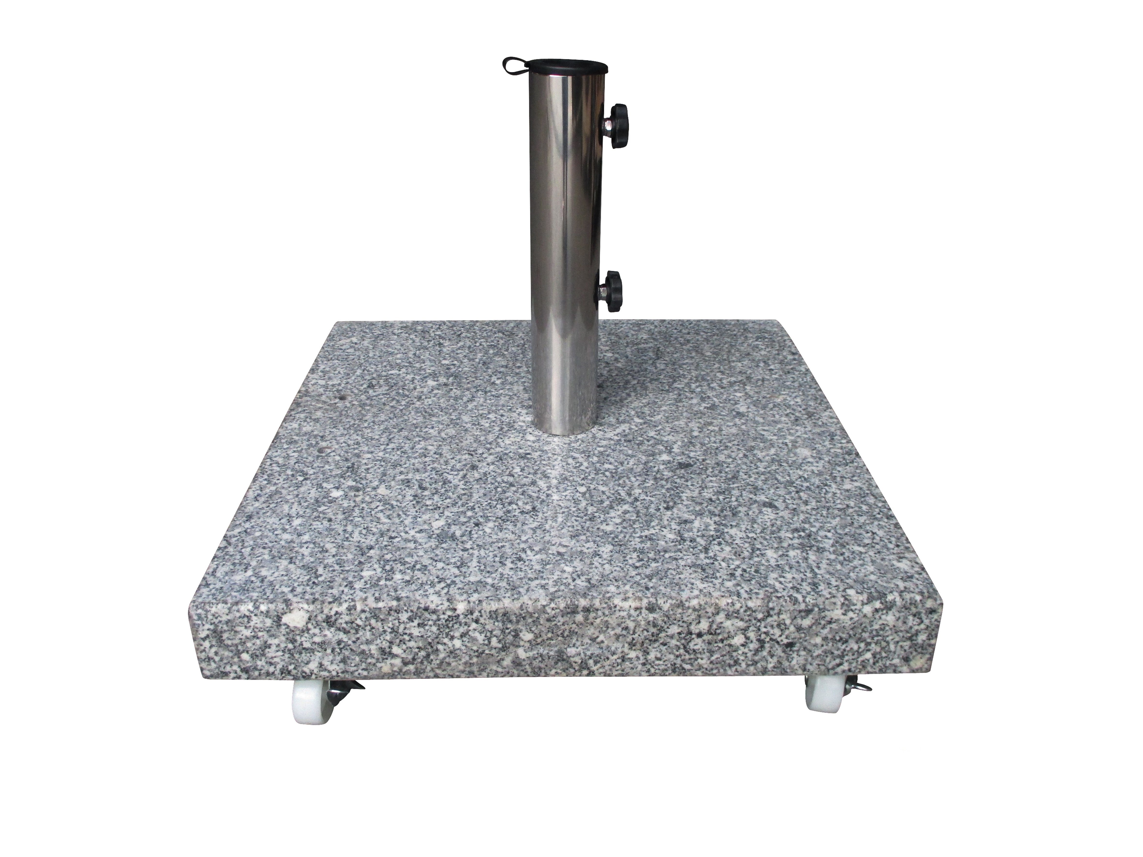 Dieser 40 kg Granitsockel mit XXL-Rollen sorgt bei den Sonnenschirmen für stabilen Halt. Er ist nicht nur hochglanzpoliert und robust– Sie können den Sockel dank den vier Rollen ganz einfach bewegen und verschieben. Durch das Ziehen des Sockels erfolgt keine Beschädigung des Bodens, da der Sockel mit vier Kunststoffrädern ausgestattet ist. Mit einem stabilen Edelstahlrohr und zwei Feststellschrauben kann der Gartenschirm sicher befestigt werden. Zusätzlich werden Reduziereinsätze mit unterschiedlichen Durchmessern (bis 54 mm) mitgeliefert. Freuen Sie sich auf diesen flexibel einsetzbaren Sockel für Ihren Terrassenschirm!