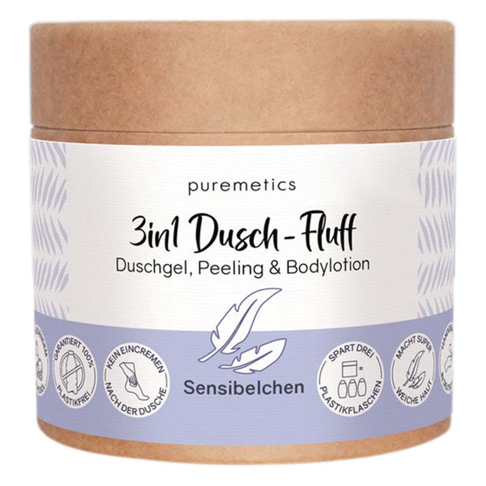Der Dusch-Fluff wird sanft auf der feuchten Haut einmassiert und anschließend gründlich abgespült. Für die tägliche Anwendung geeignet.