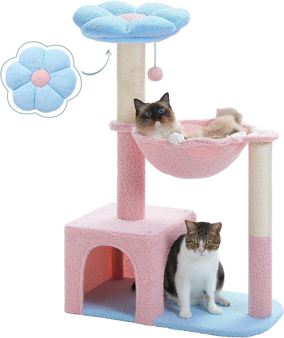 Der Kratzbaum Blumen-Plattform bringt ein Stück Wüste in dein Zuhause! Dieser einzigartige Kratzbaum mit Blumen-Plattform und Höhle bietet deiner Katze nicht nur viel Kratzfläche, sondern auch eine Plattform zum Entspannen. Die süße Blumen verleihen dem Kratzbaum ein natürliches Aussehen, das sowohl deinem Stubentiger als auch dir gefallen wird. Katzenbaum mit Blumenmotiv: Unser niedlicher Katzenbaum ist nicht nur funktional, sondern auch ästhetisch ansprechend. Die Spitze des Baumes verfügt über ein charmantes blumenförmiges Design, das jedem Raum einen Hauch von Niedlichkeit verleiht und gleichzeitig einen gemütlichen Platz für Ihre kleinen Kätzchen bietet. [30% Erhöhung der Stabilität] Der niedliche Katzenturm verfügt über eine geräumige und stabile Basis, um sicherzustellen, dass Ihre Katze spielen und klettern kann, ohne zu wackeln oder umzukippen. [Mehrstufiges Design] Unser Kratzbaum für Indoor-Katzen sind mit mehreren Ebenen und Plattformen mit Kratzbäumen gebaut, bieten verschiedene Höhen und Räume für Ihre Katze zum Erkunden und Erobern. [Einfache Montage] Sie müssen sich keine Sorgen um komplizierte Montageprozesse machen. Unser Blumenkatzenbaum für Indoor-Katzen wird mit einer detaillierten Bedienungsanleitung und Installationsanleitung geliefert, um eine schnelle und einfache Einrichtung zu gewährleisten. Verbringen Sie mehr Zeit mit Ihren Katzen und weniger Zeit mit dem Zusammenbauen von Möbeln! [Höhere Qualität und einfache Reinigung] Das Brett besteht aus Spanplatten der Güteklasse P2, die von CARB zertifiziert ist. Unser Blumenkatzenturm verfügt über stabile und mit natürlichem Sisalseil umwickelte Kratzstämme. Die Teppich-Lappenoberfläche dieses rosa Kratzbaums ist super einfach mit einer Bürstenrolle zu reinigen. Wir legen großen Wert auf die Gesundheit und das Wohlbefinden Ihrer Katze, um sicherzustellen, dass sie ihre Spielzeit ohne Sorgen genießen kann. S: 62L x 34B x 90H cm, 6 KG, 3 Stock; M:43L x40B x 120H cm, 10 KG, 5 Stock.