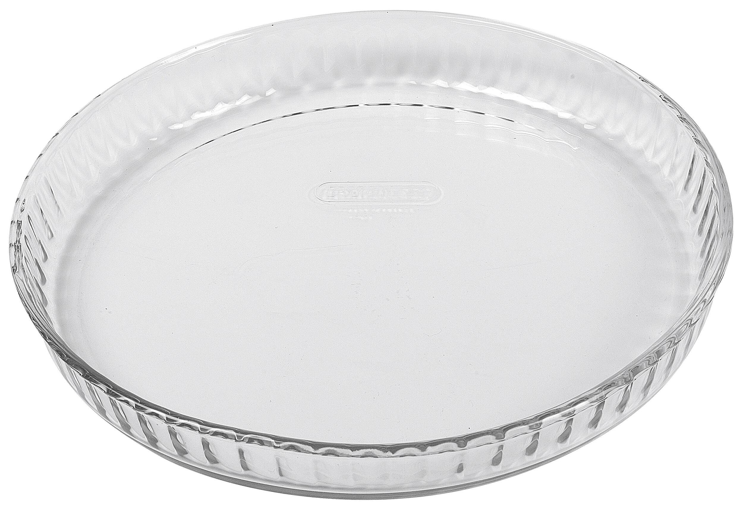 Material: Glas. Farbe: transparent. Größe: ca. 28 cm. Hitzebeständige und kälteunempfindliche Obstkuchenform, geeignet für Gas- und Elektroöfen sowie Mikrowellen. Spülmaschinenfest für einfache Reinigung.