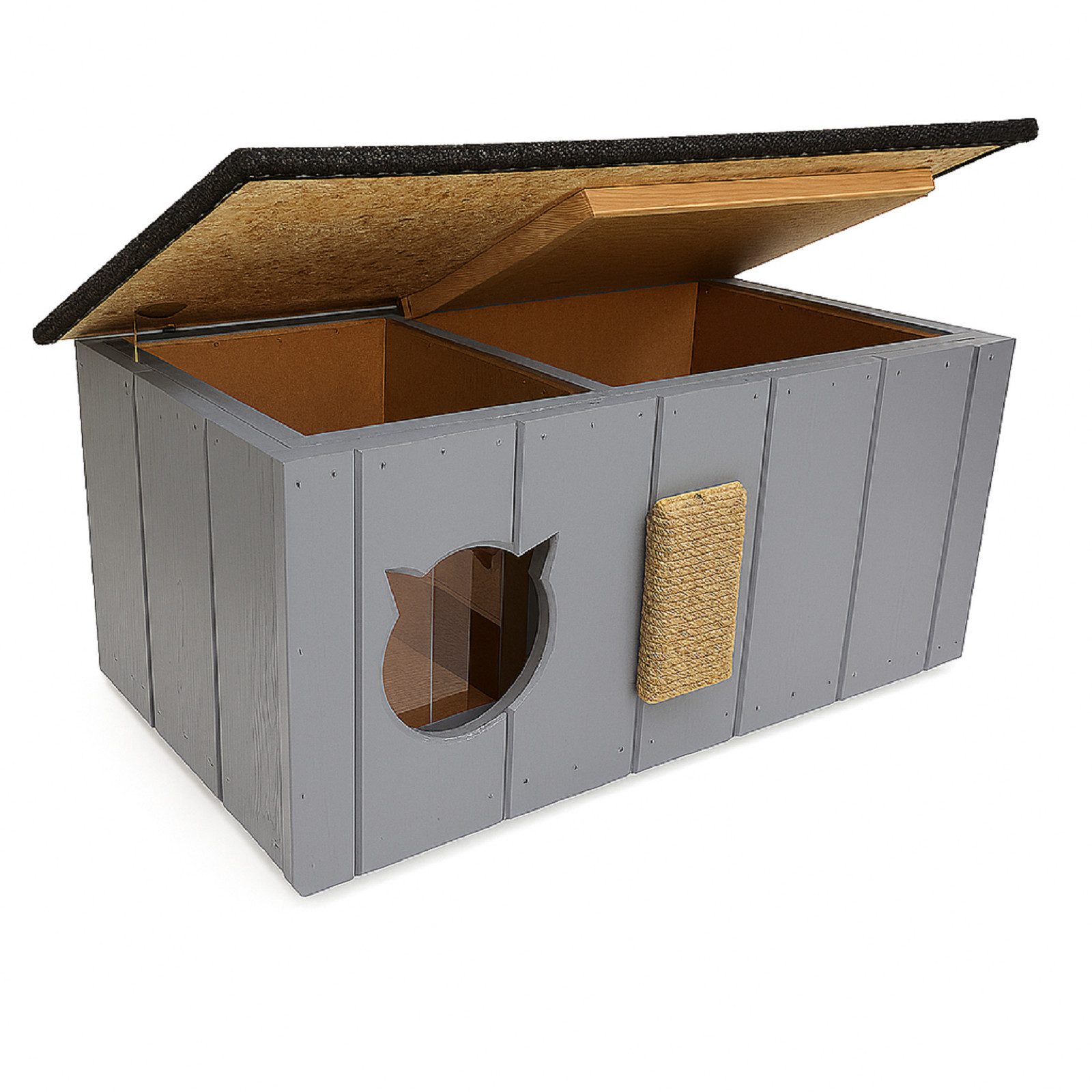 Die robuste Bauweise mit dreifach imprägniertem Holz, wasserfestem OSB3-Boden, abwaschbarem HDF-Innenraum und aufklappbarem Dach macht nicht nur Ihre Katze glücklich – auch Sie werden das leichte Handling lieben. Und das integrierte Sisal-Kratzbrett bringt Spaß und gesunde Krallenpflege mit sich.