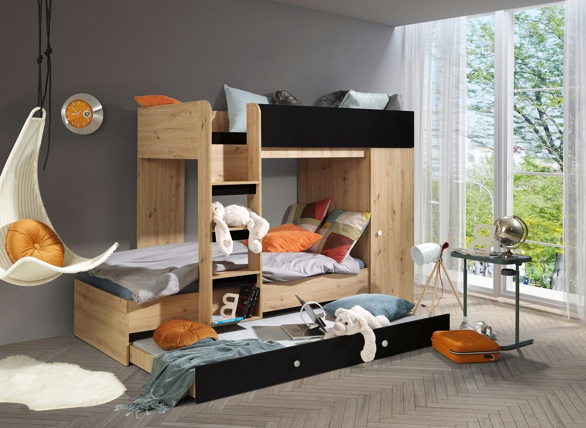 "Sam 2" ist ein modernes Hochbett mit bis zu 3 Schlafflächen und einem Schrank. Es eignet sich sehr gut für kleinere Kinderzimmer. Mit einer stimmigen Farbkombination der Farbe "Eiche Artisan" mit den zur Auswahl stehenden Farben "Weiß" und "Schwarz" kann sich das Etagenbett sehen lassen. Die obere Liegefläche ist für die Matratzengröße 200 x 90cm und die untere für 200 x 85cm. Unten gibt es noch eine Bettschublade mit 6 Rollen, die als Stauraum oder auch als zusätzliches Gästebett genutzt werden kann (Liegefläche: 200 x 85cm). Im Seitenbereich ist ein 1-Türiger Schrank mit 1 oberen Fach und 1 Raum mit Kleiderstange (Breite-50, Höhe-134, Tiefe-60cm). Die Matratzen werden auf robuste Möbelplatten gelegt (keine Lattenroste nötig). Max. Belastbarkeit der oberen Betten: 80kg. Max. Belastbarkeit der Gästeliege: 50kg. Max. Höhe der Matratze in der Bettschublade: 8 cm. Das Hochbett kann mit der Leiter sowohl auf der rechten, als auch auf der linken Seite aufgebaut werden. In diesem Angebot sind keine Matratzen inklusive. Die Lieferung erfolgt bis Bordsteinkante (standardmäßig). ACHTUNG: eine Lieferung mit Reintragen also bis in die Wohnung gegen 50 EUR Aufpreis (zahlbar bar bei Lieferung) auch möglich - wenn Sie Interesse haben, rufen Sie uns spätestens am nächsten Werktag nach der Bestellung unter 02166-2627072 an. Falls Sie sich bei uns nicht melden, gehen wir davon aus, dass Ihre Lieferung standardmäßig und ohne Aufpreis bis Bordsteinkante erfolgen soll.